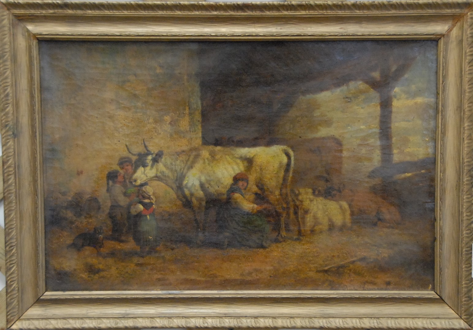 Rus Zimermann interior barn scene with cows, oil on canvas singed lower right Rus Zimermann. 11 x 17