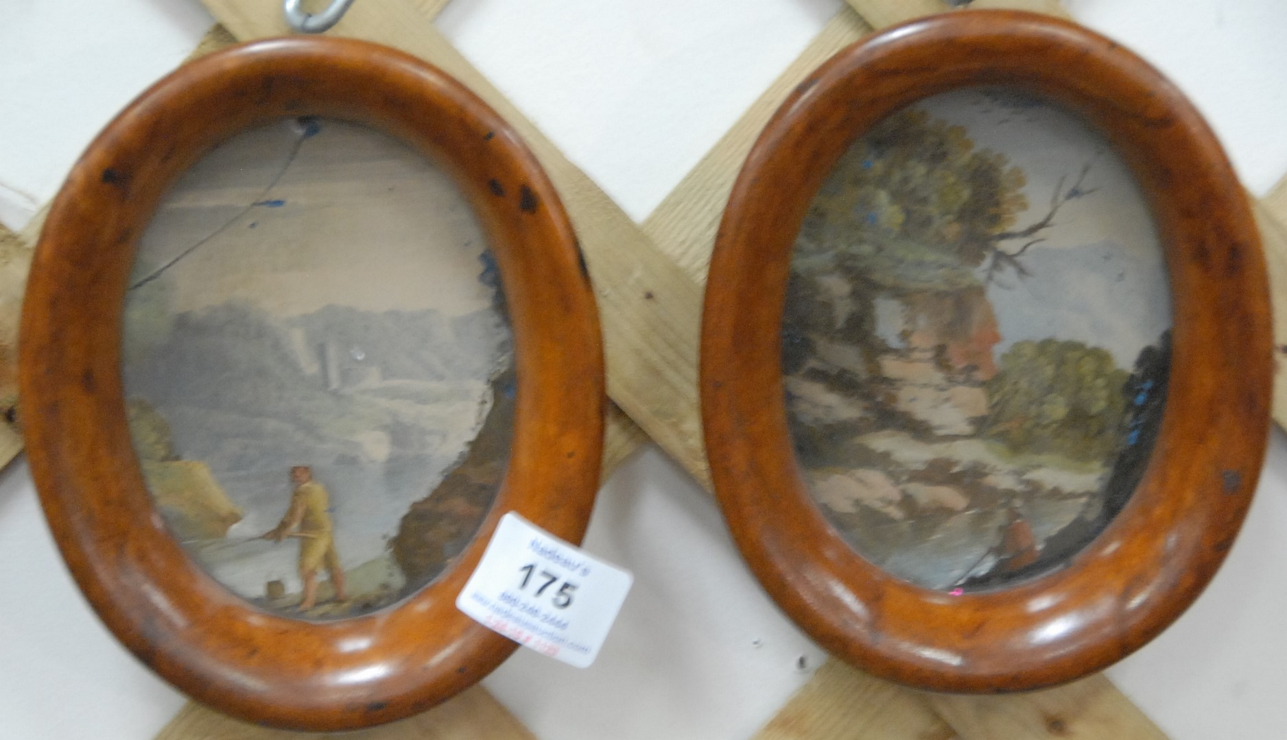 Pair of 19th century reverse paintings on glass of men fishing in oval frames one glass cracked. 5 1/2 x 4 1/2