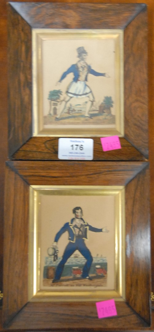 Pair of Victorian watercolor collages with silk and paper, T. P. Cooke and Mr. Farrell in rosewood frames. both 5 1/4 x 4 1/2