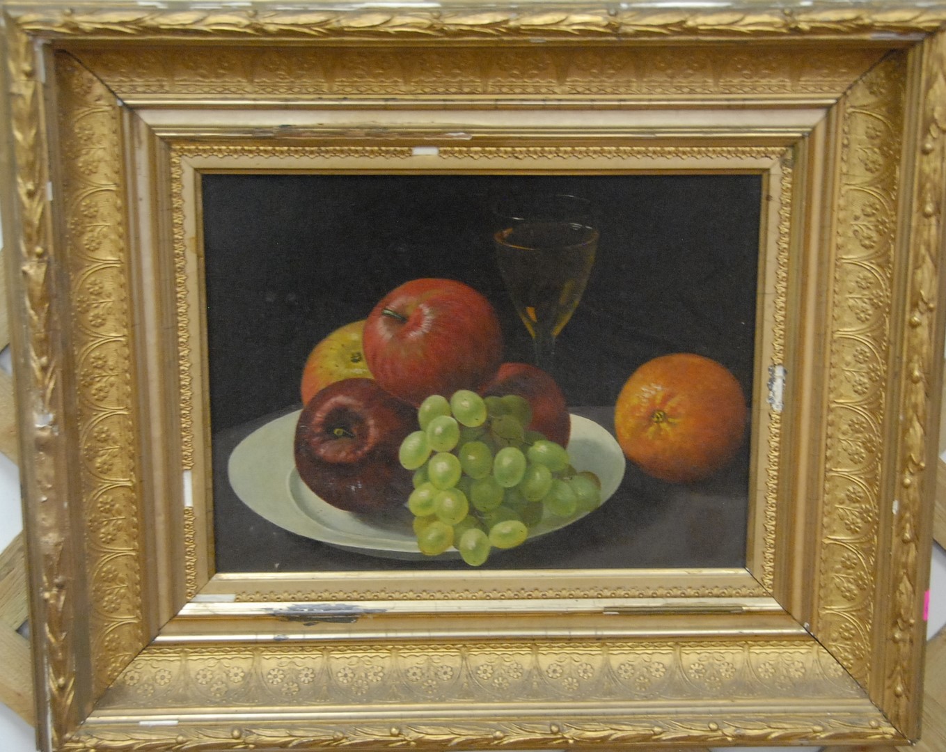 19th/20th century still life of fruit with glass of wine, oil on canvas, unsigned, in gilt Victorian frame. 12 x 9