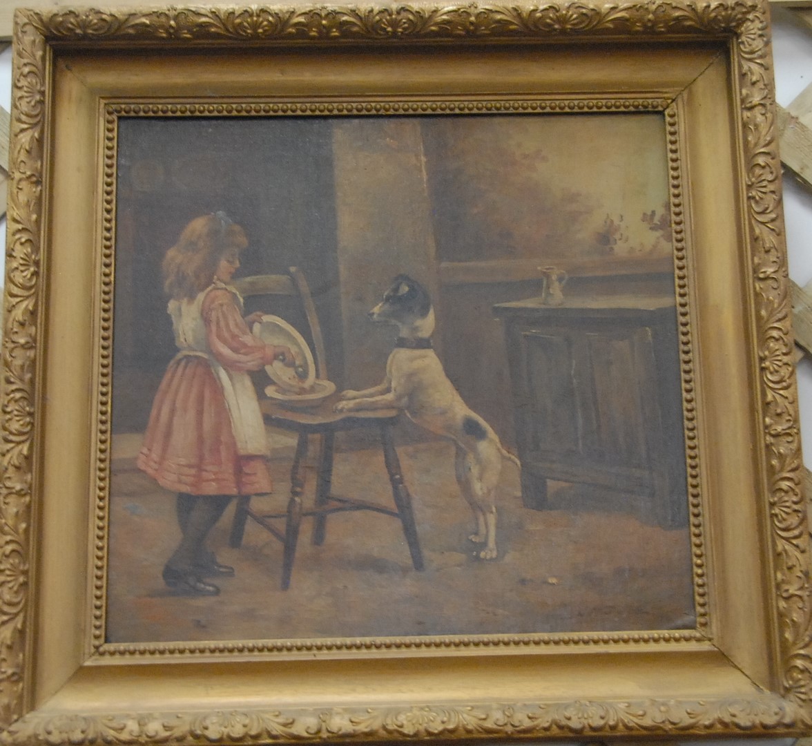 Oil on canvas painting of young girl feeding a dog marked lower right J. H. Dolph 74 16 x 17
