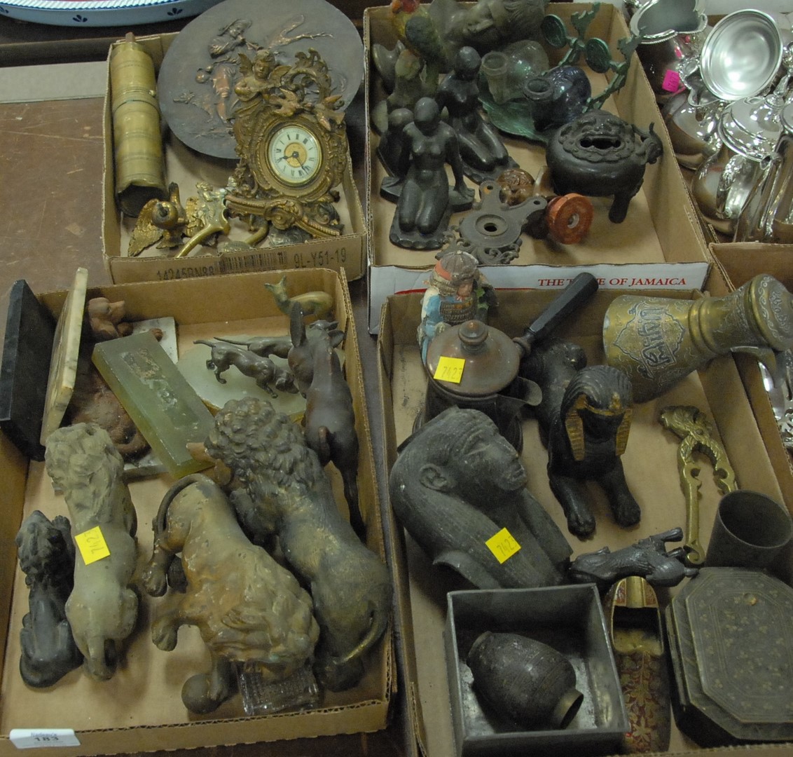 Four box lots of bronze, metal, copper, and brass items to include bookends, iron bird, bronze censors, copper plaque, lions, dog figures, etc.