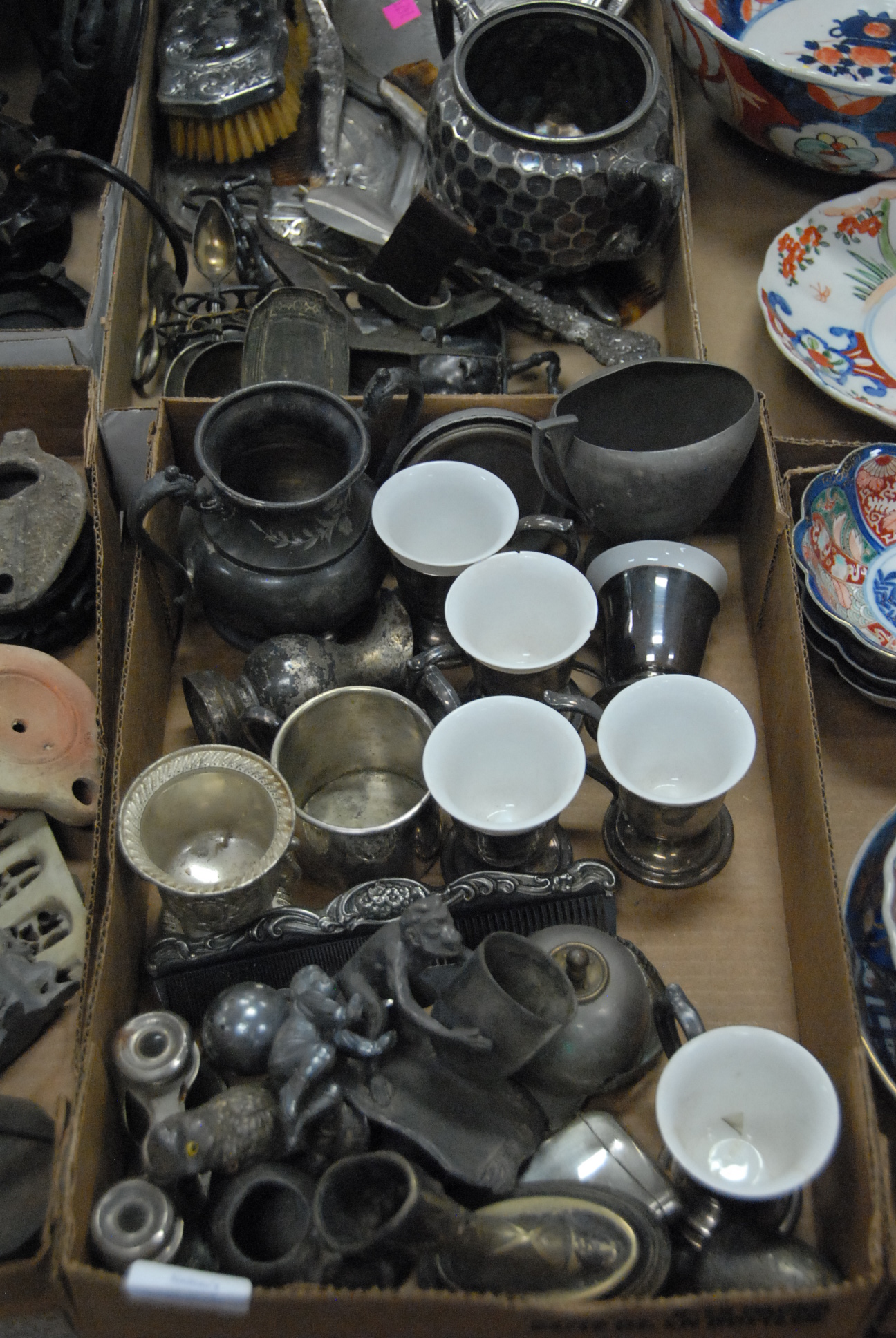 Two box lots of silverplate to include dresser set, figural stickpin holder, two figural toothpick holders, etc.