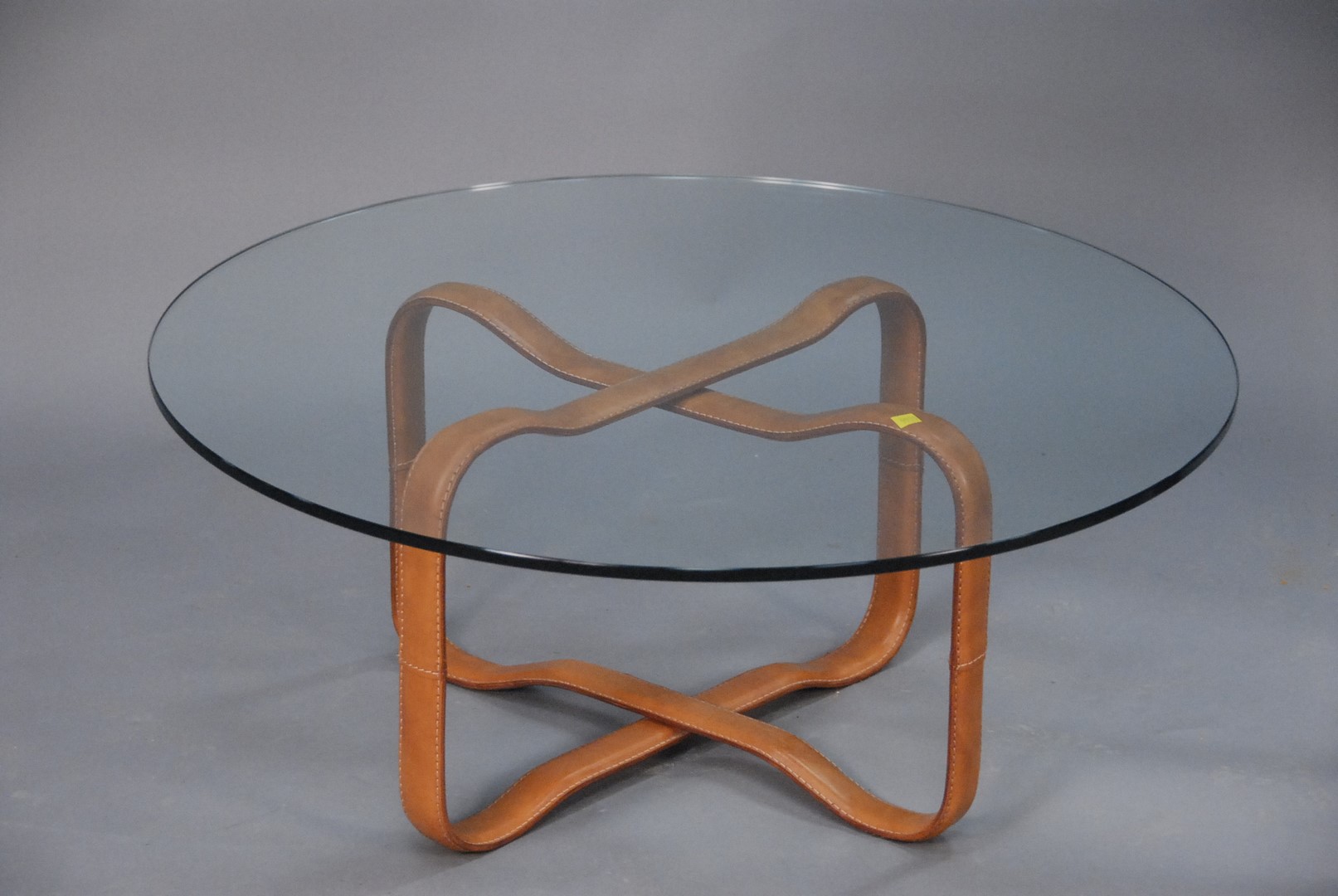 Ralph Lauren glass top table with leather base. ht. 15 in. dia. 35 1/2 in.