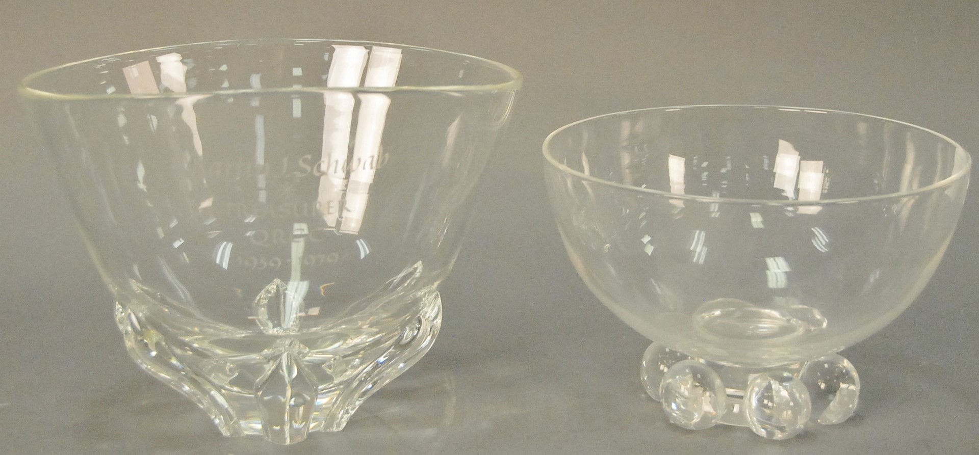 Two large Steuben crystal glass bowls, one with ball feet ht. 5 1/2 in. dia. 8 1/2 in. and the other given as a reward ht. 7 1/2 in.