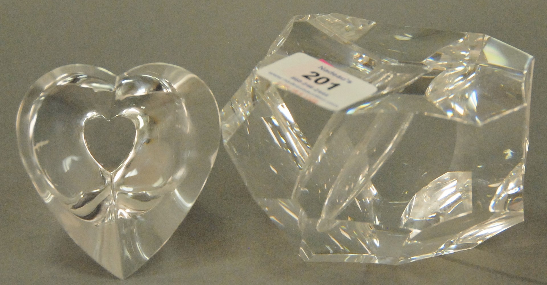 Two Steuben crystal paperweights, retired Heather Throb and a crystal inkwell in the form of a stone.