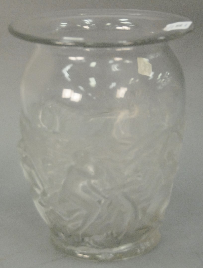Crystal clear and frosted vase with mermaids and dolphins two chips on base. ht. 9 1/2in.