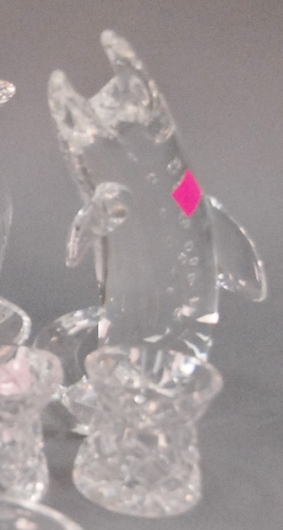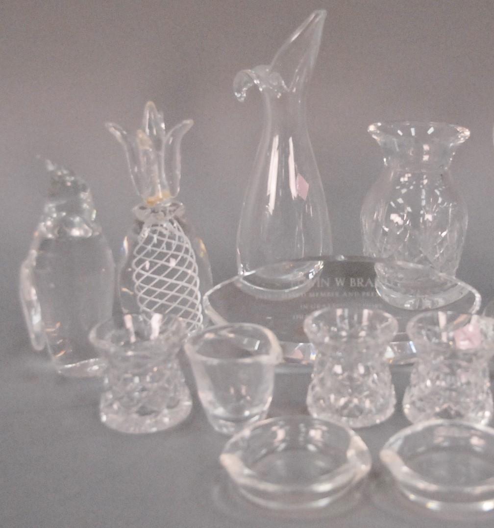 Group lot of crystal to include penguin, and pineapple as is Waterford open salts and vase and four small Steuben pieces and a Steuben vase.