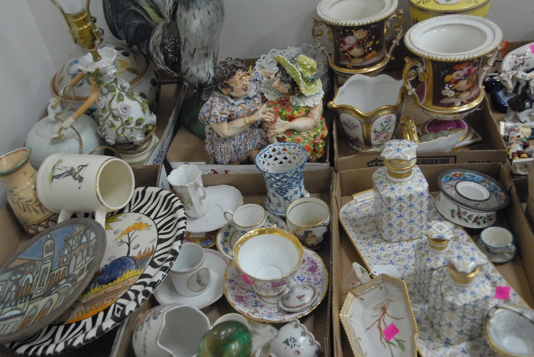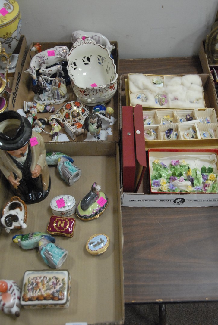 Three box lots to include royal Crown Derby place card holders, Halcyon Days enamels peint main Limoges ox, Herend box, capodimonte box, porcelain figures, etc.