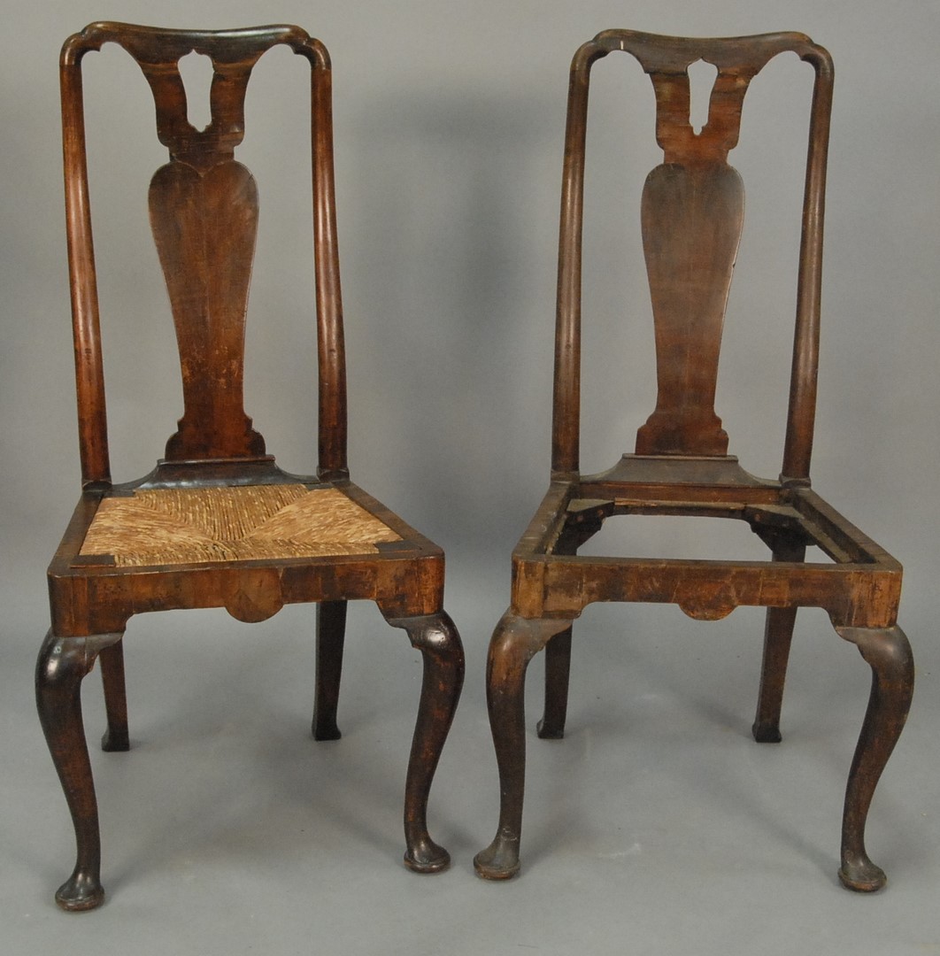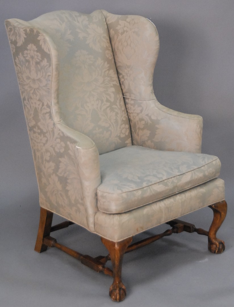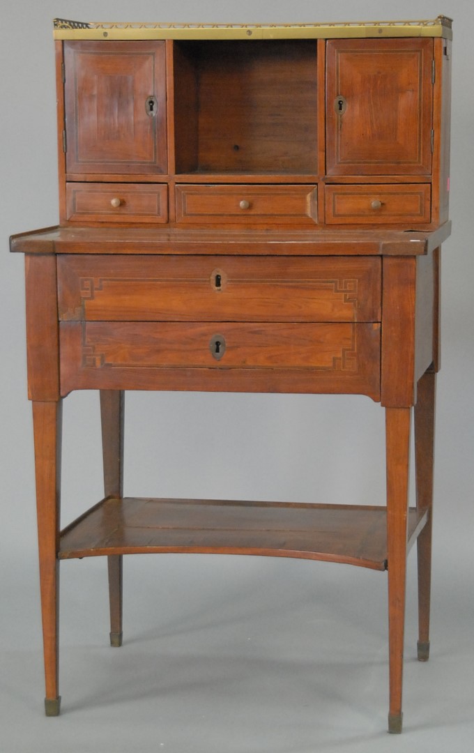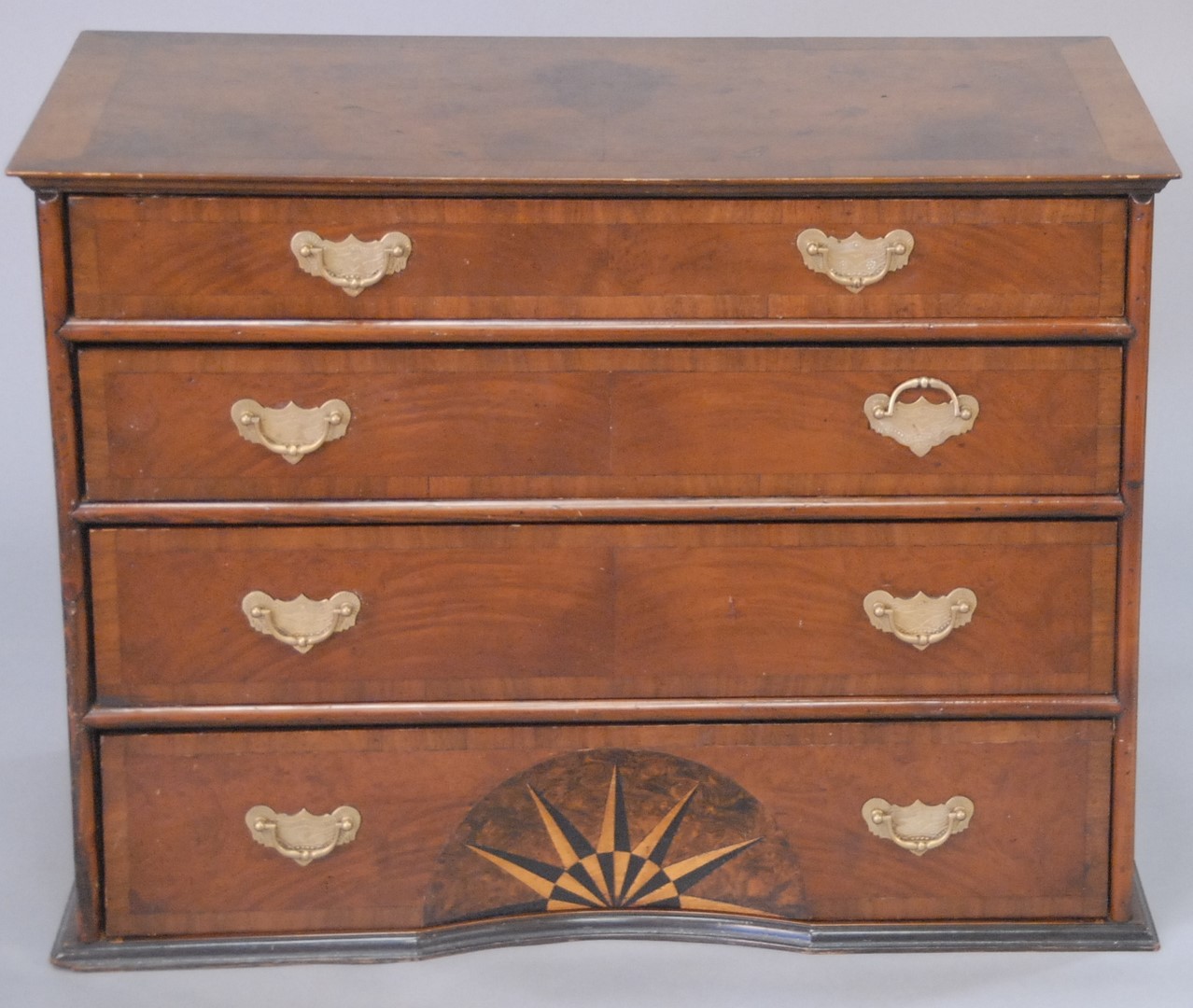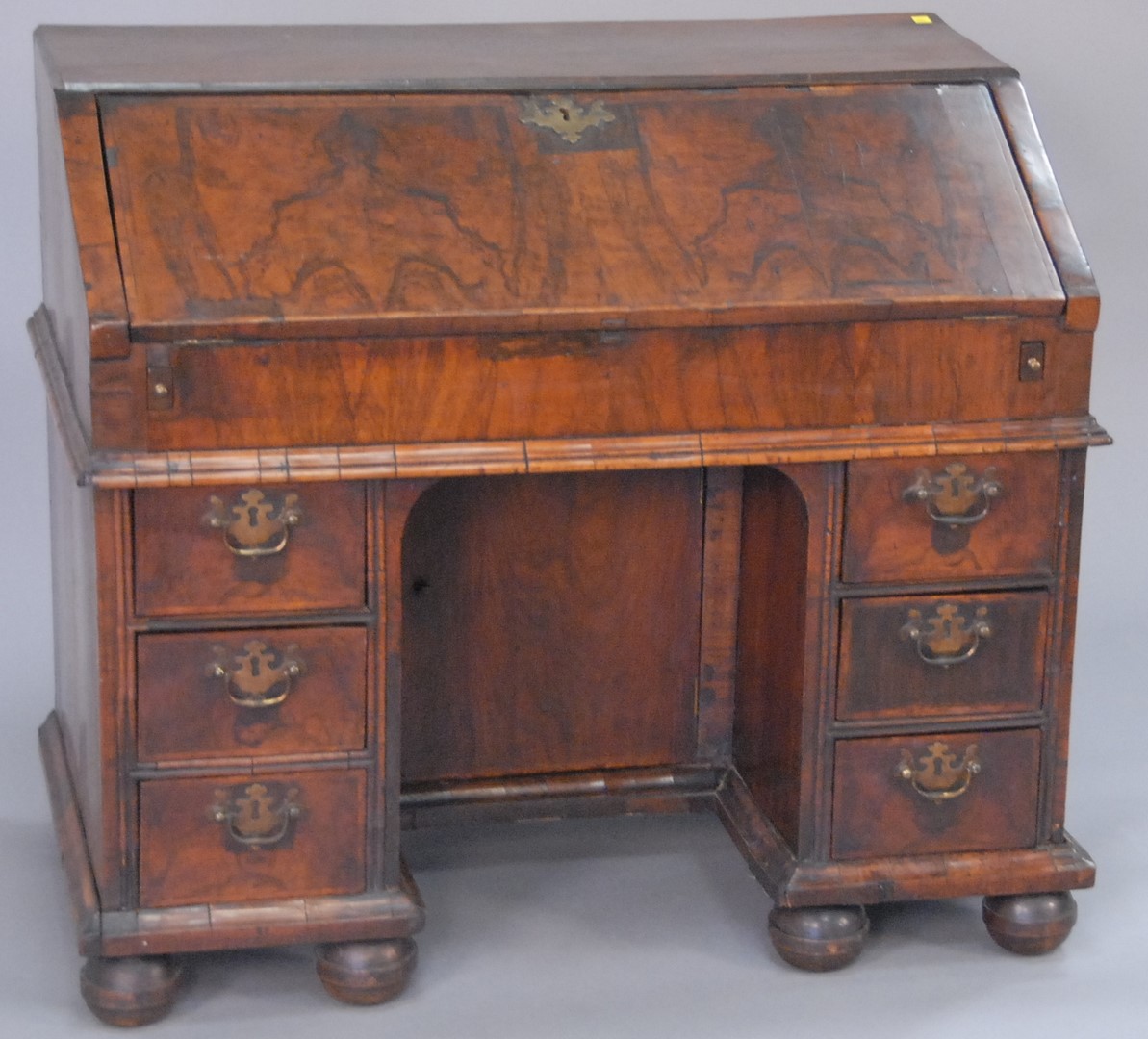 Queen Anne burlwood kneehole desk having slant lid, interior with well, double bank of drawers, and center door all on ball feet, early 18th century. ht. 32 1/2 dia. 35 1/2