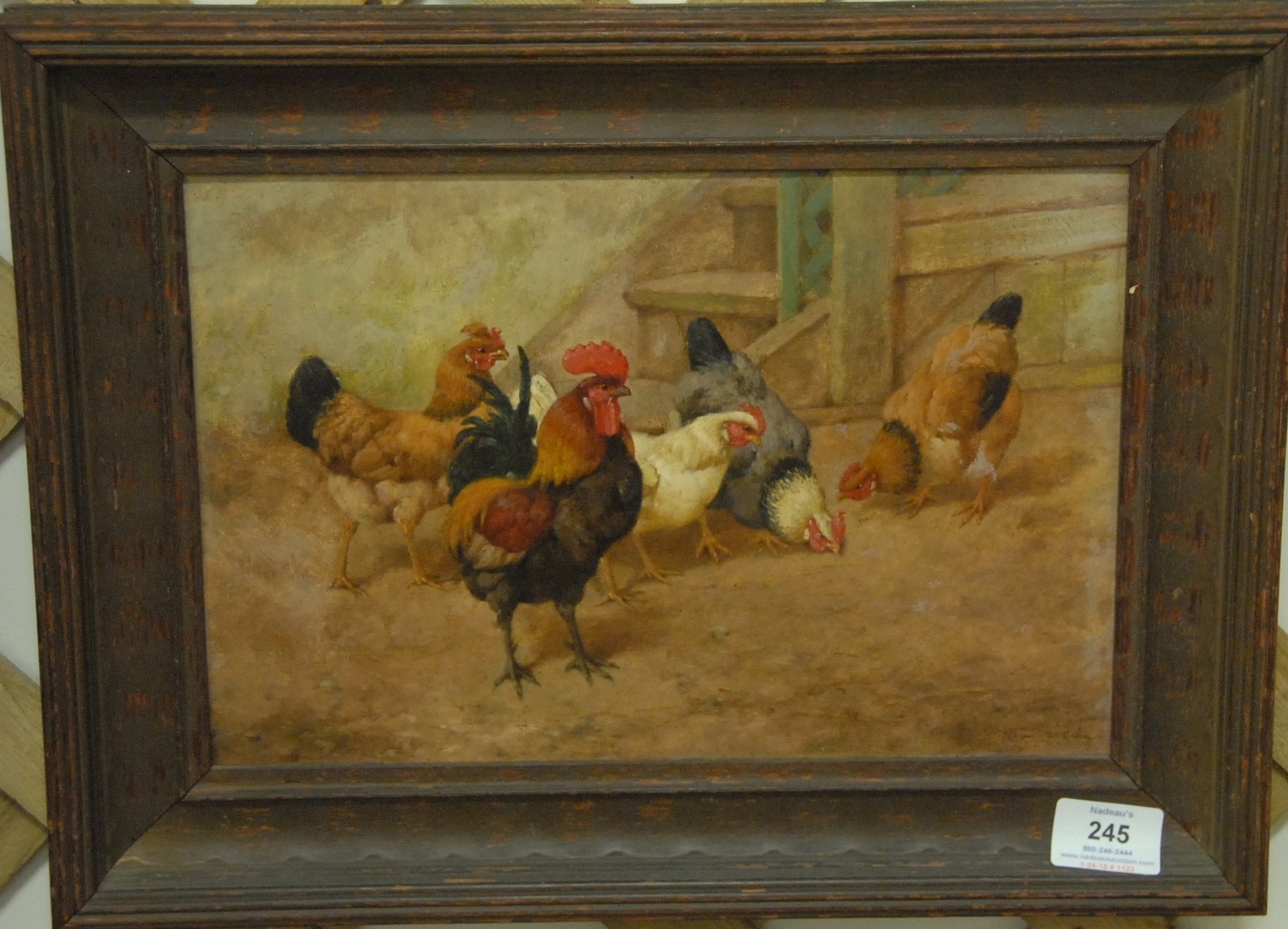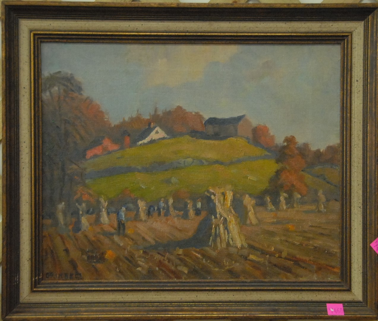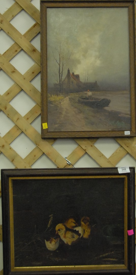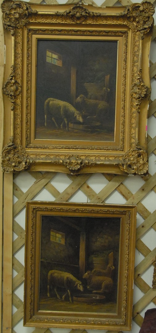 Two paintings to include Leathea Whitaker Minnick 1891-1985 SHEEP IN THE BARN oil on canvas signed lower left L. Minnich, and a copy of Minnick. 13 x 16 and 13 x 16