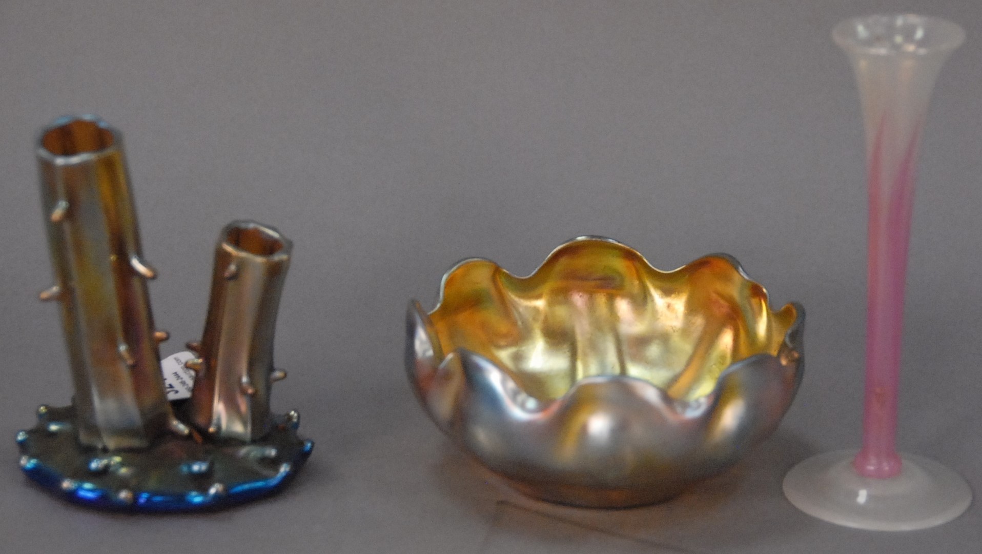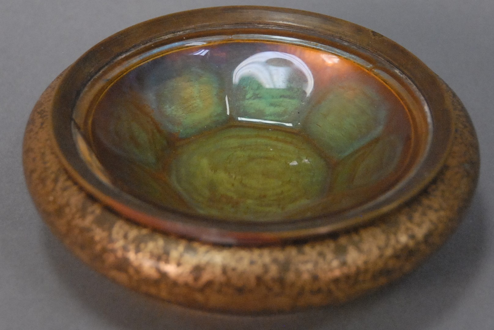 Rare Tiffany Furnaces Ashtray, gold ashtray with original Favrile tortoise shell design insert, signed on bottom Louis C. Tiffany Furnaces Inc. Favrile 315 crack in glass. dia. 5 in.