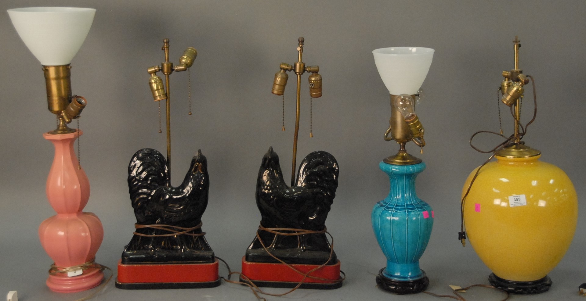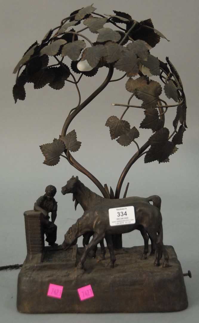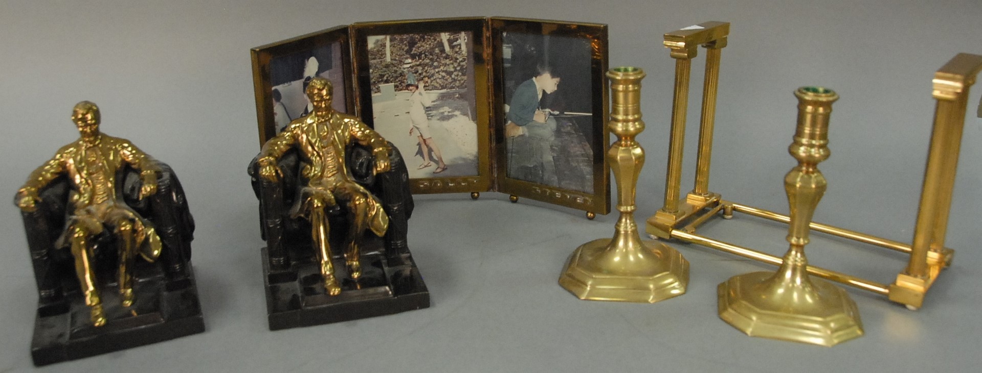 Group of six brass items to include Dirk Van Erp three fold picture frame, pair of Colonial Williamsburg candlesticks, pair of bronze and brass Lincoln bookends, and brass column bookend.