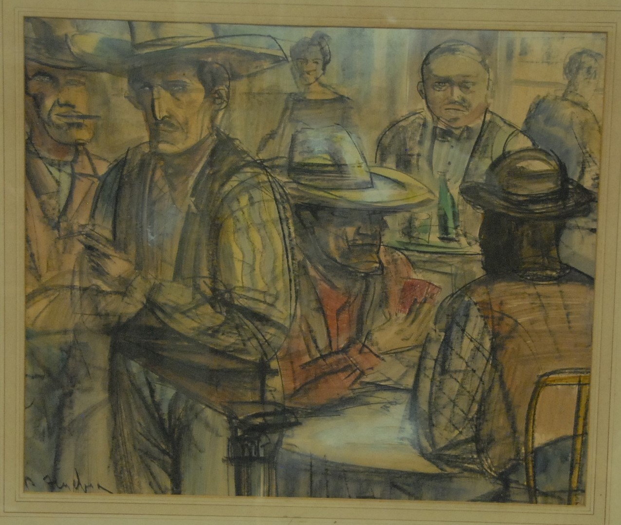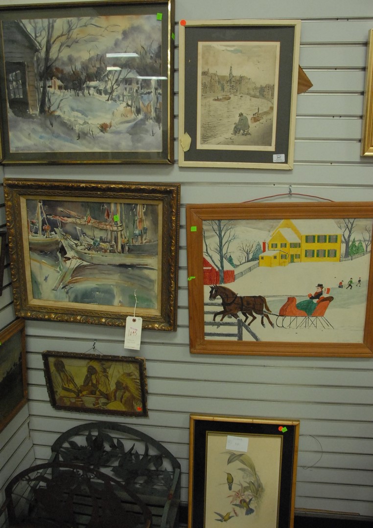 Six framed items to include watercolor of sailboats moored signed lower left John Wharf, watercolor snowscape signed Harry Lippe, oil on board snowscape with horse and carriage signed lower right Griffen, colored etching signed Sagal, print of Humming birds, and print of Indian. 15 x 10 to 25 x 20