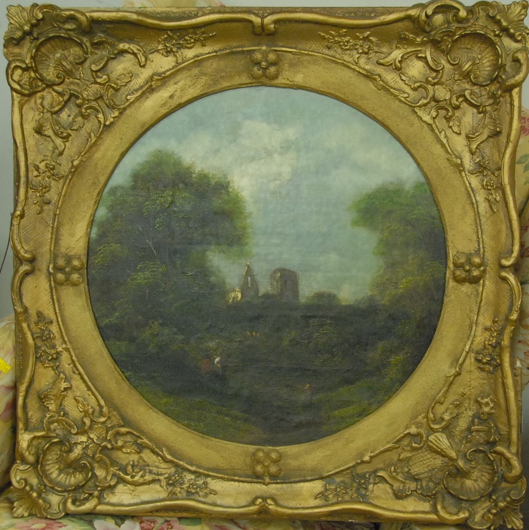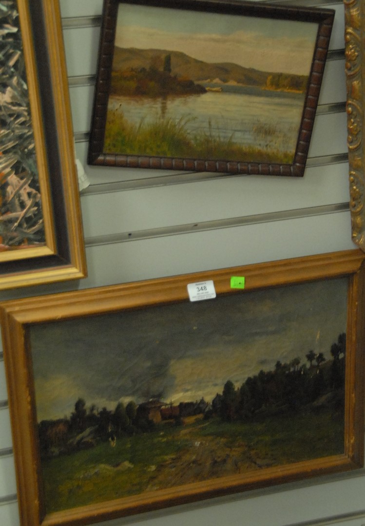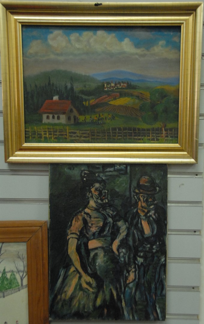 Two piece lot to include oil onboard Spanish lanscape and oil on canvas of two Spanish figures signed lower left indistinctly Roualt Cy Millman. 12 x 16 and 16 x 12