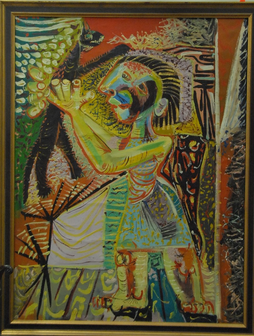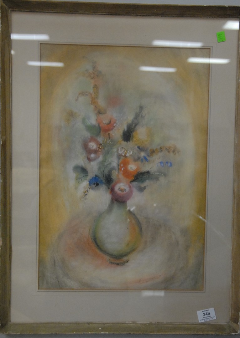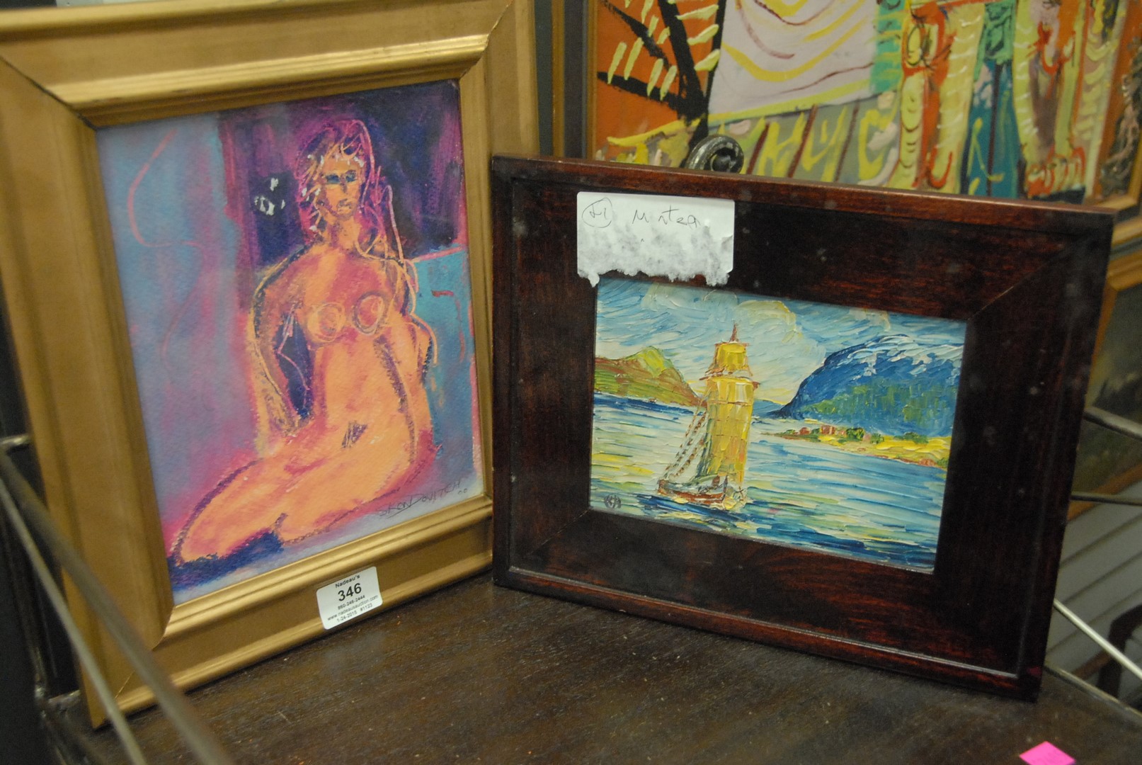 Two piece lot to include Alfred Skondovitch 1926-2011, mixed media on paper, Orange Nude signed in pencil lower right Skondovitch along with an oil on board painting of saling vessel monogrammed lower left. 8 x 6 and 8 x 10