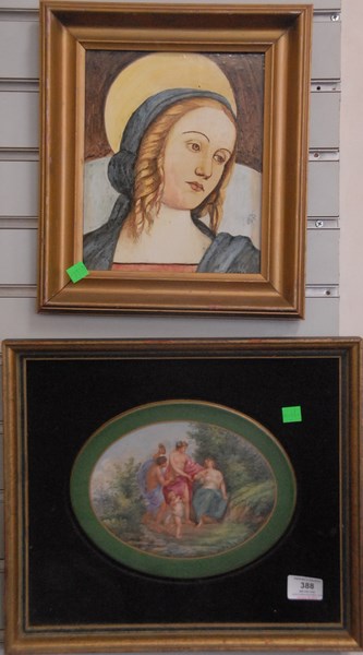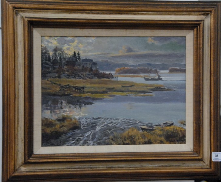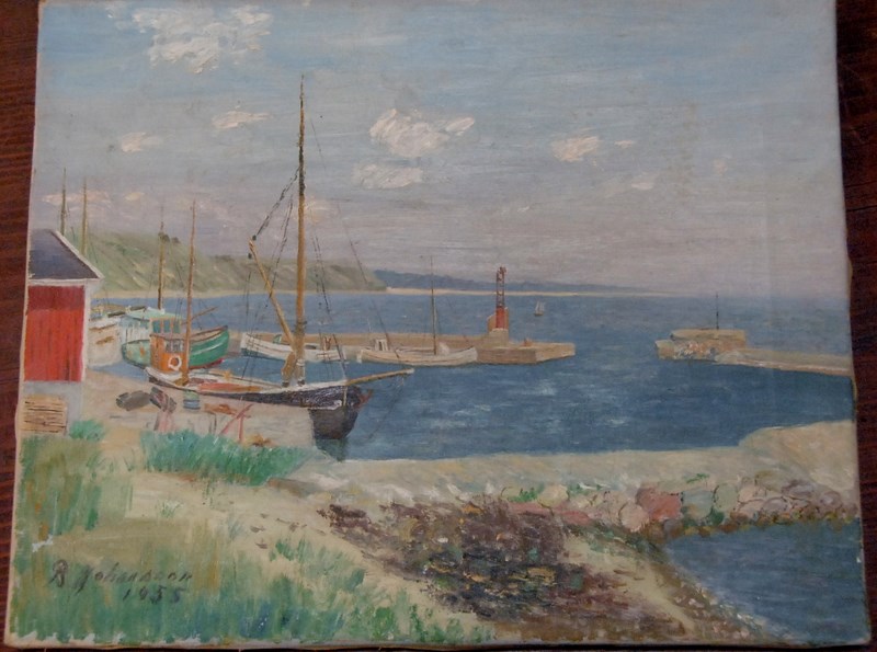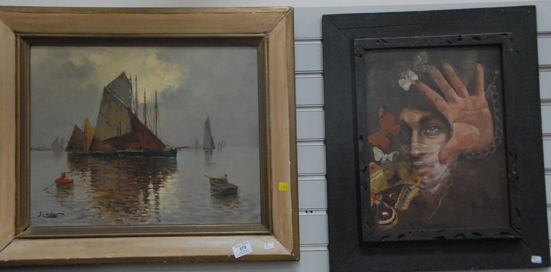 Two oil paintings to include Marie de Marsan oil on board mystical signed lower right Marsan 15 1/2 x 11 1/2 and a Continental oil on canvas of sailing vessels signed lower left J. Lader 16 x 19.