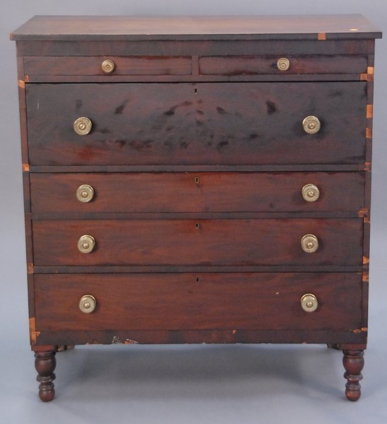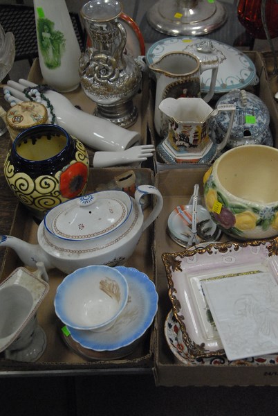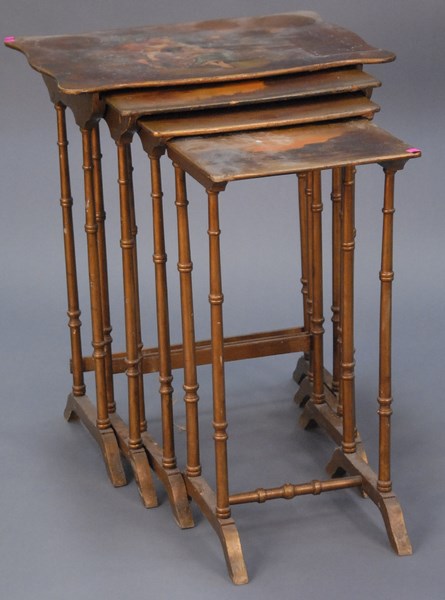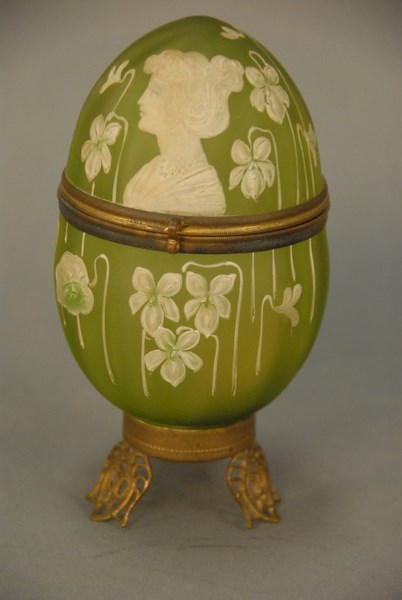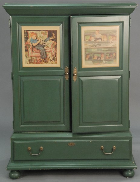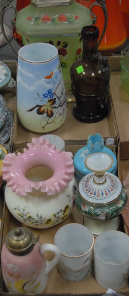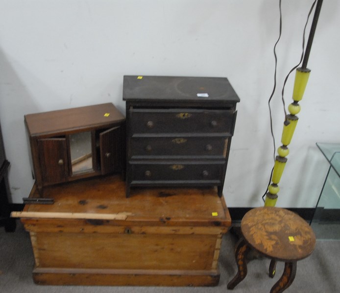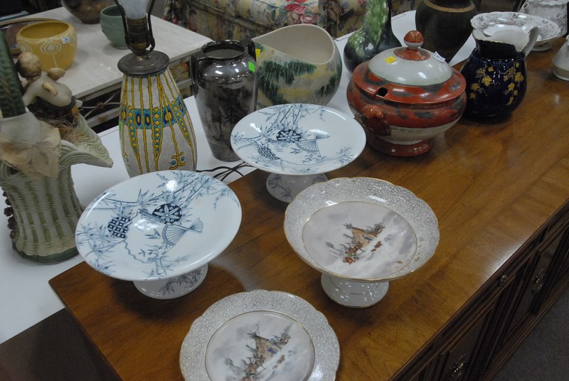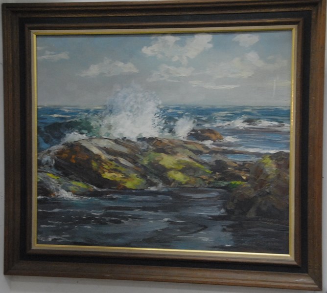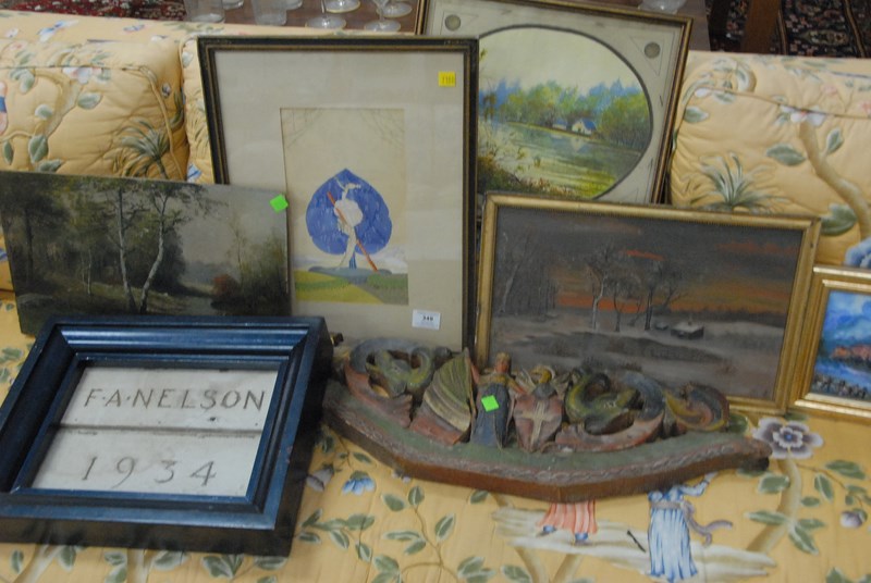 Group of seven paintings to include watercolor signed Colas of house on pond, small oil on board initialed L.B., gouache of art nouveau decorating tree, two unsigned oil on board, carved painted piece, and 1934 Nelson clap boards.