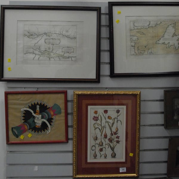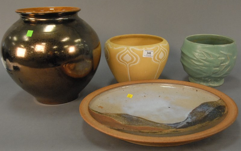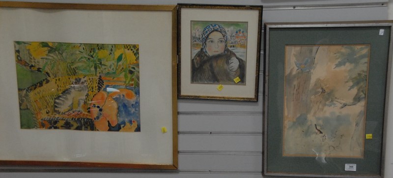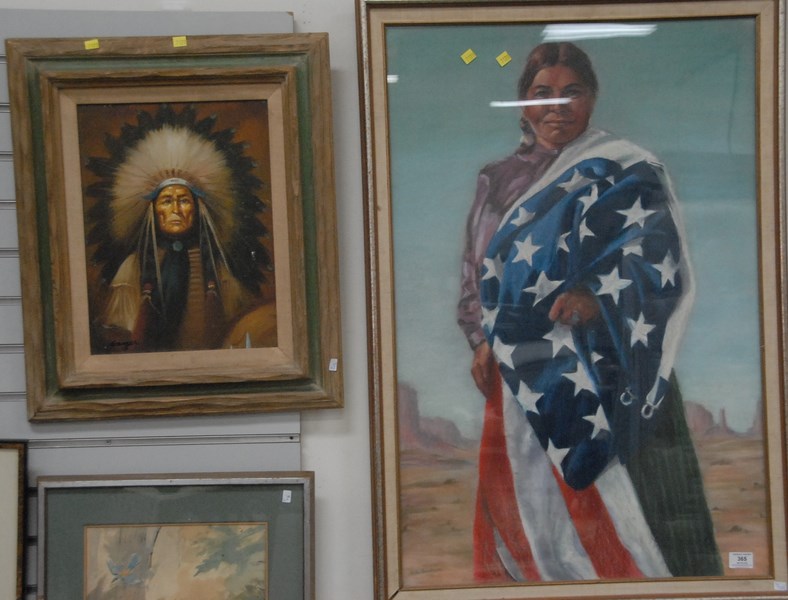 Four piece lot to include two Indian paintings to include Catherine Brodeur Emily Kickapoo pastel 36 x 23, and bust of an Indian Chief signed lower left Granger 16 x 11 1/2 along with two Native American baskets.