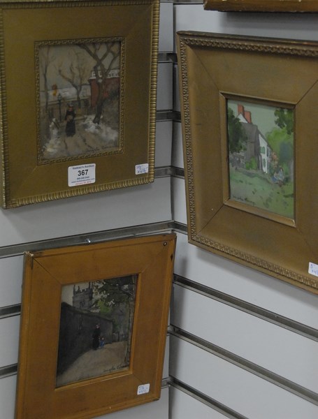 Angela O’Leary 1879-1921 three landscapes with people, two signed lower left and one signed lower right Angela O’Leary, 5 1/2 x 4 1/2, 5 1/2 x 4 1/2, and 5 x 4 1/2.