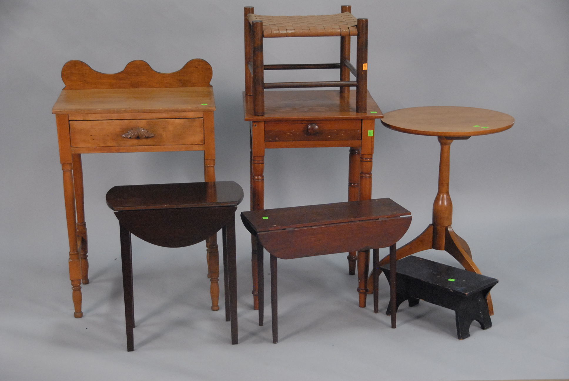 Twelve piece group of iron outdoor furniture to include a lounge chair, two armchairs, tea cart no glass, four tables, low oval table no glass, and ottoman.