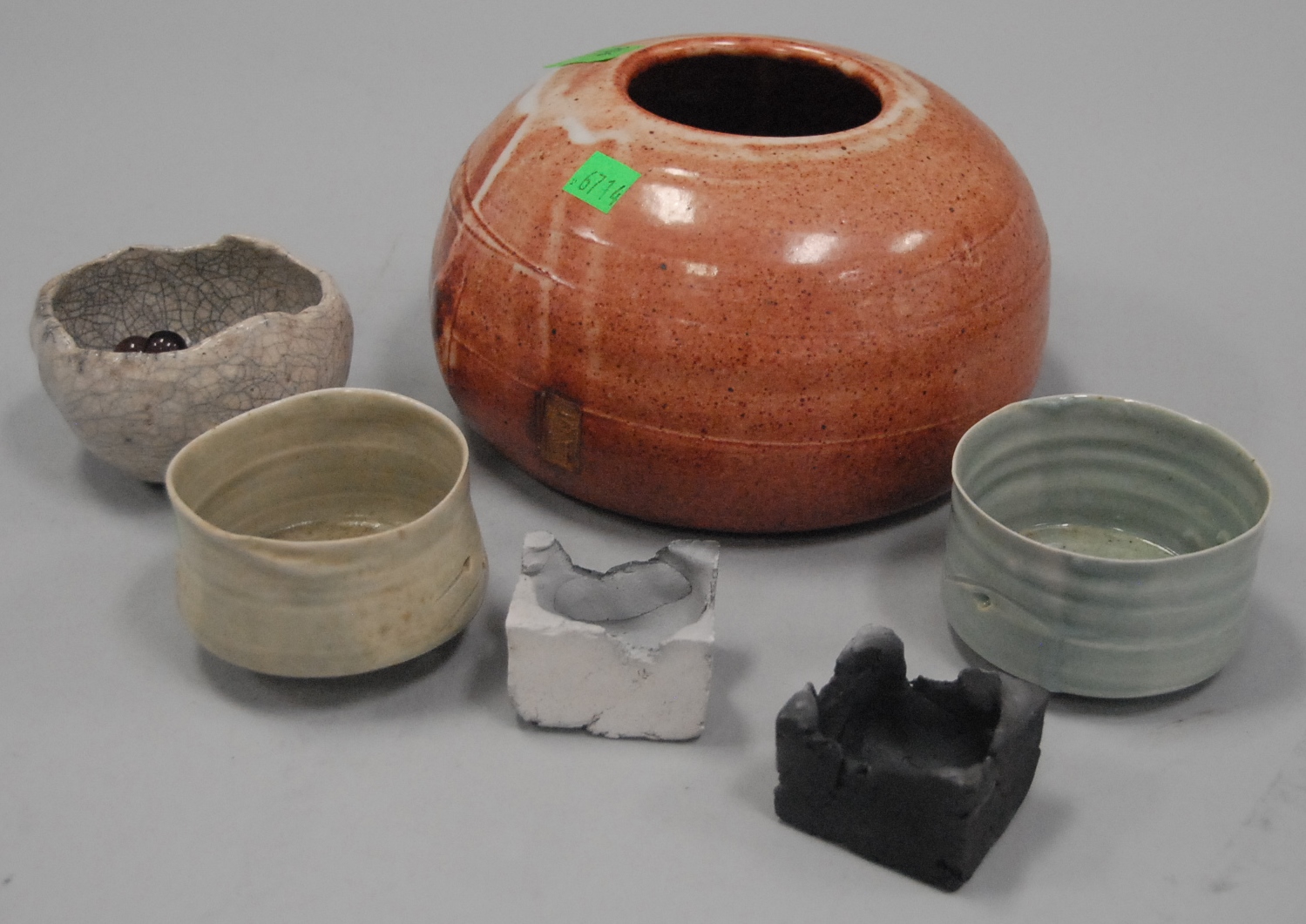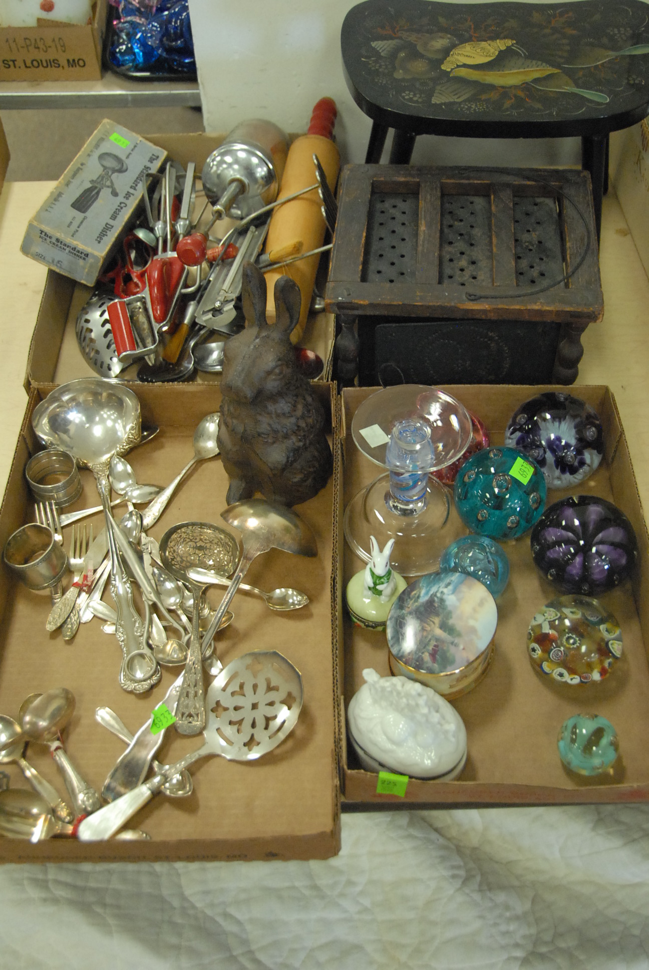 Three flat boxes to include a foot warmer, group of paper weights include millefiori, silverplated flatware serving pieces, vintage serving pieces, Mid-Century kitchen items.