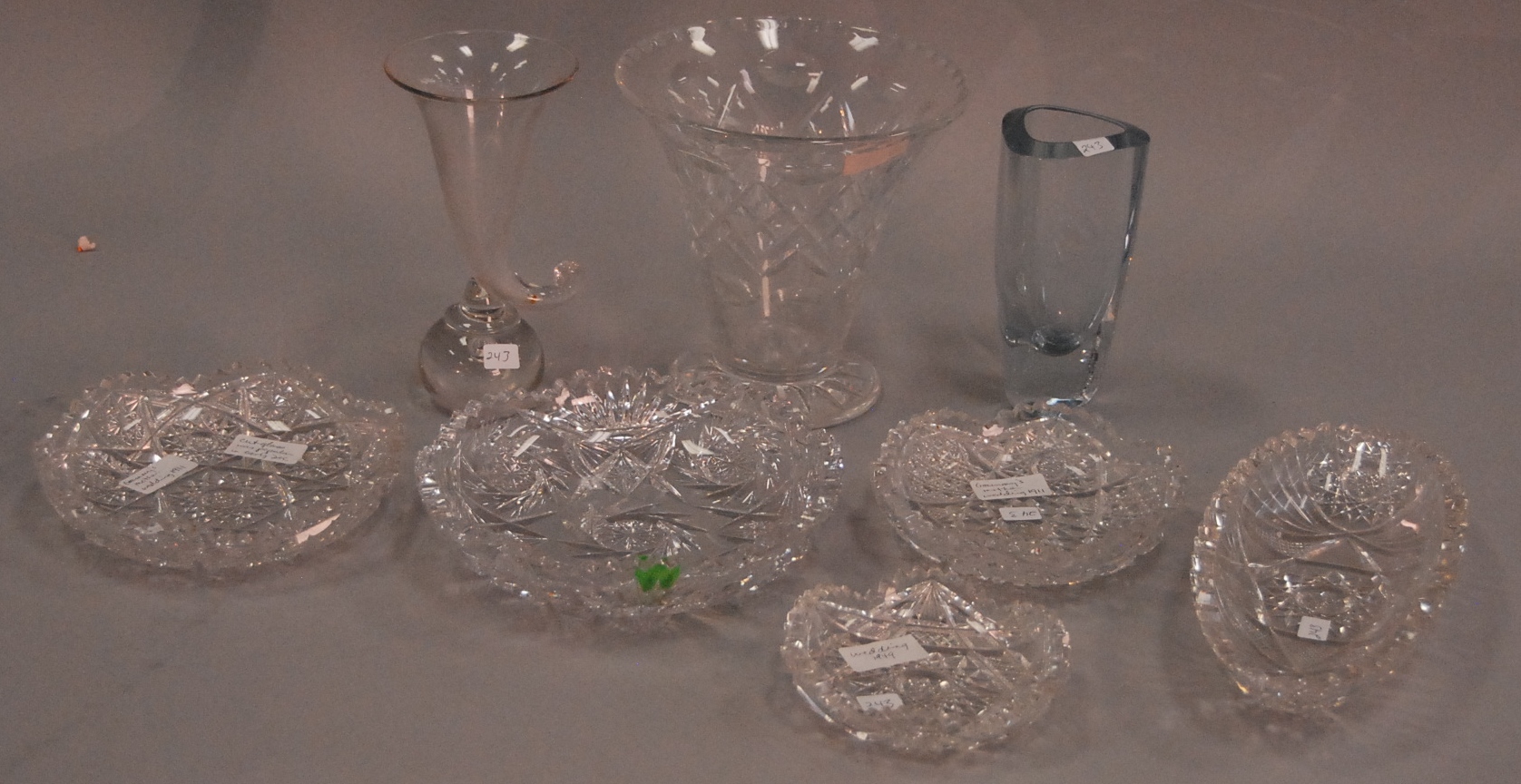 Group of eight crystal pieces to include five cut glass pieces, large Waterford compote, Orrefors bowl, and a cornucopia.