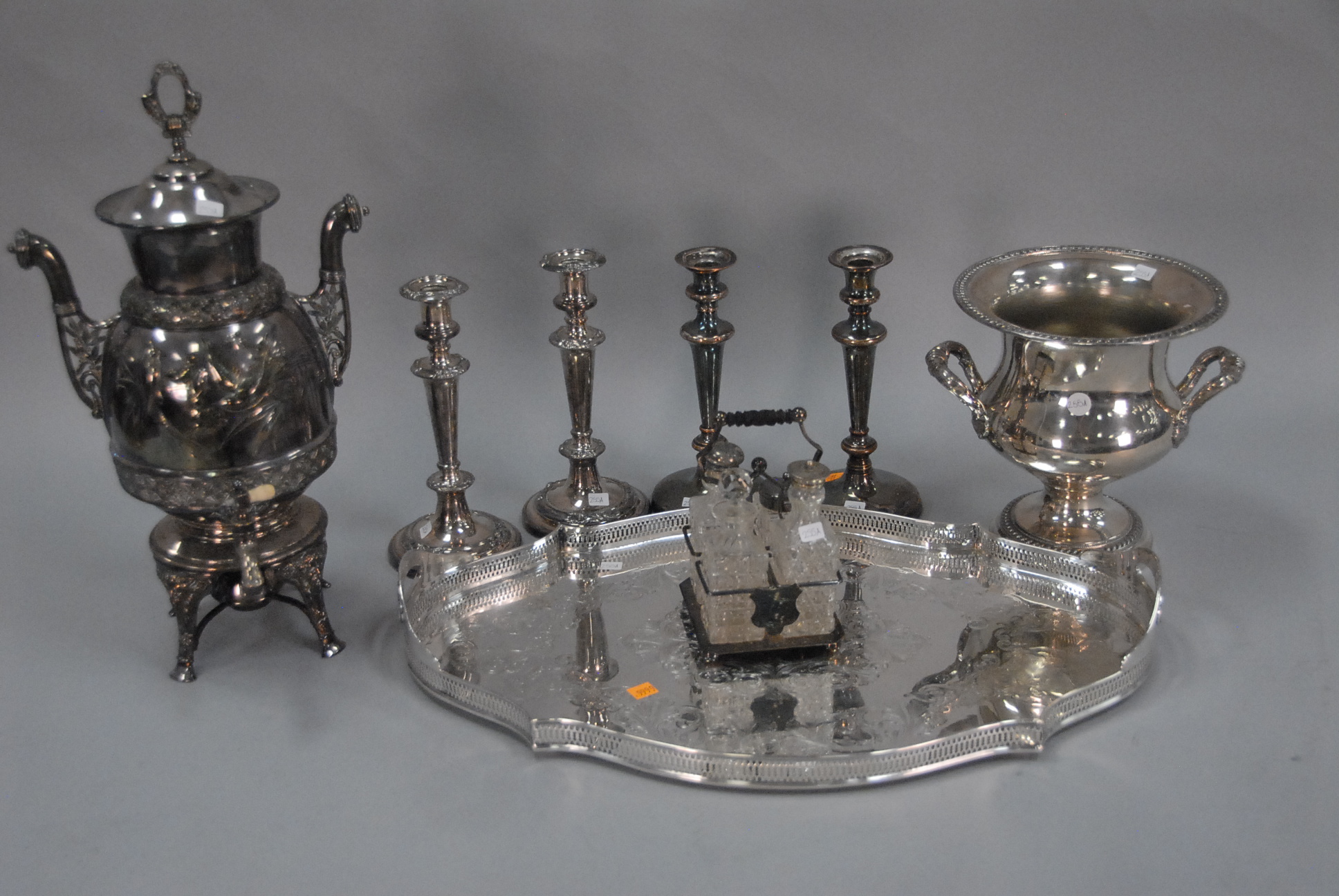 Group lot of silverplate to include four candlesticks, hot water pot, large tray, wine bucket, and castor set.