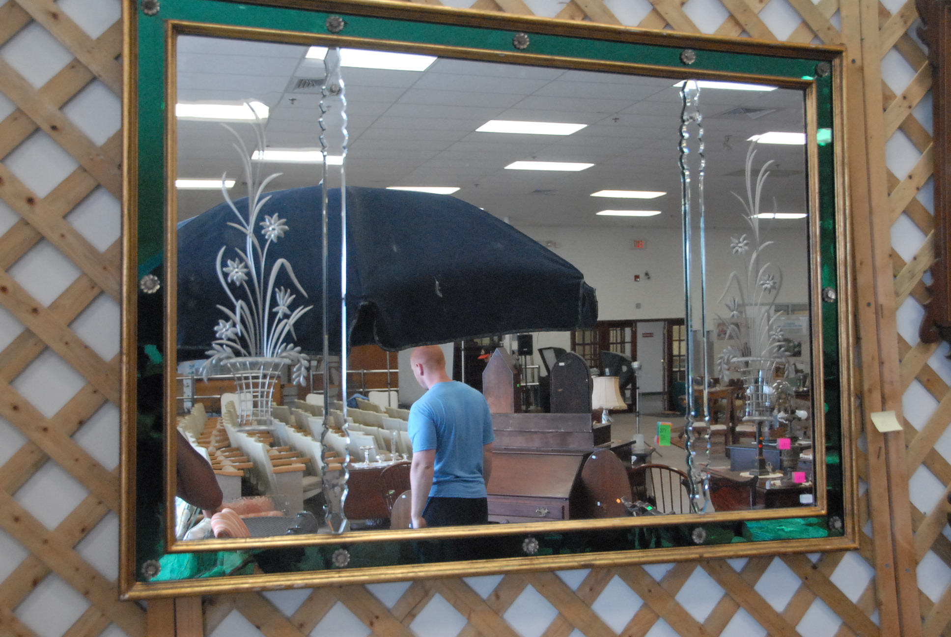 Decorative etched mirror with green mirrored frame, one small part in frame as is.