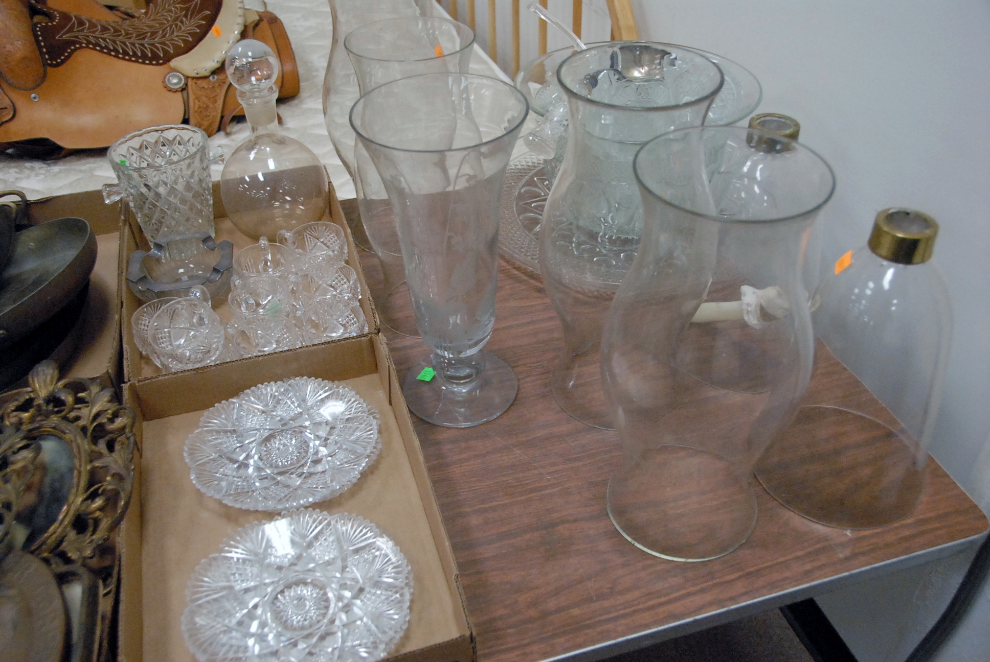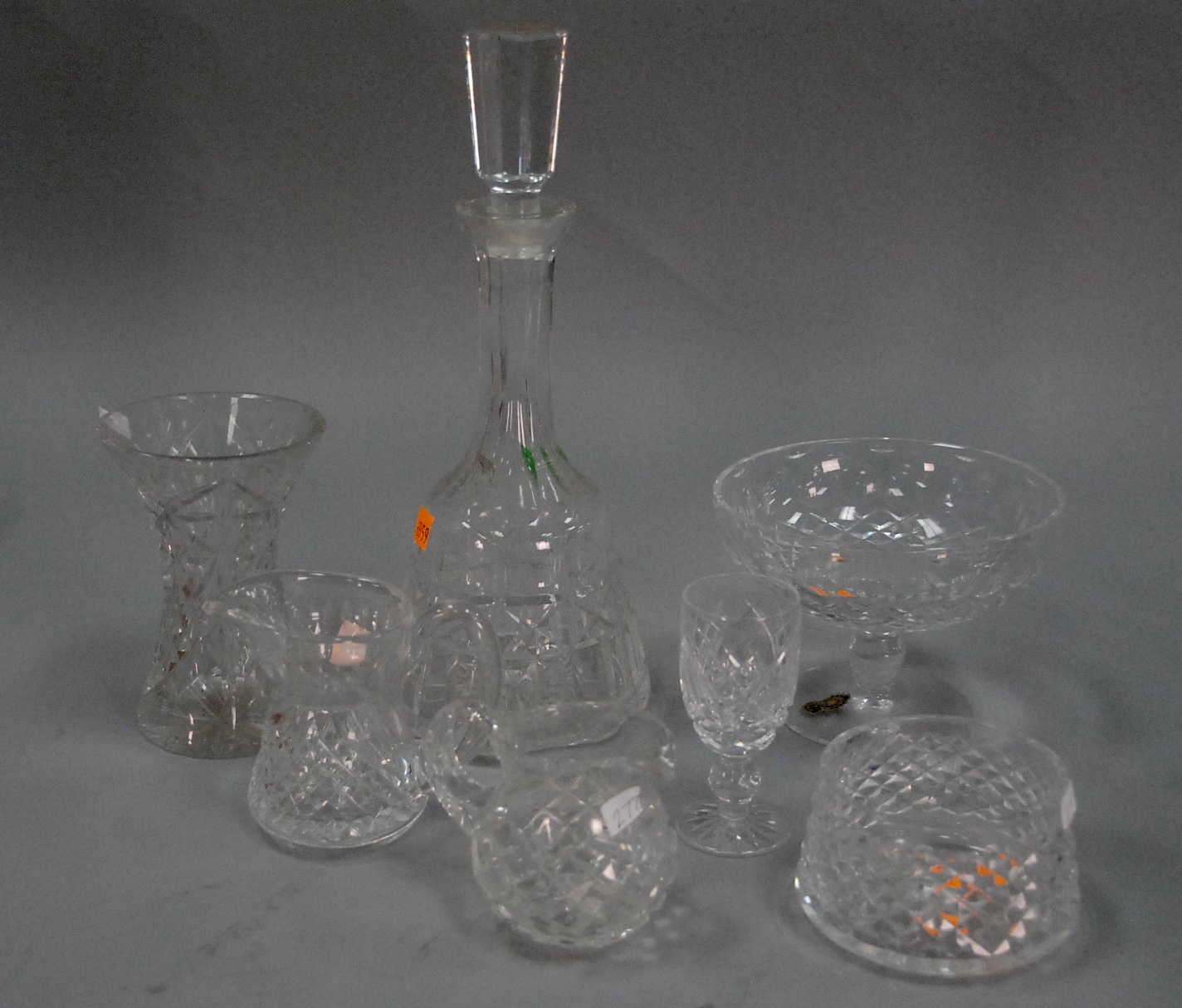 Group of cut glass items to include Waterford vase, four bowls, pitcher, two vases and two piece lot of sandwich glass to include large bowl and small plate plate with chips.