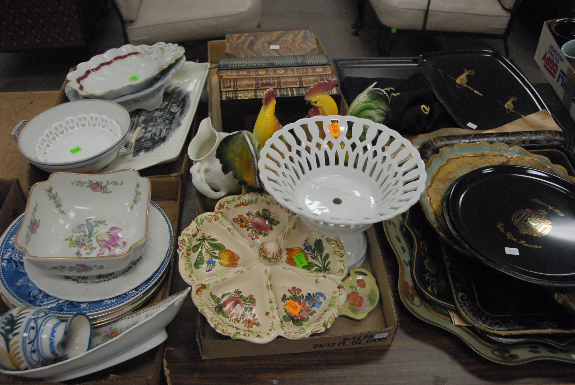 Eleven boxes of china and glass to include crystal compotes, silverplated flatware, stems, plates, Limoges plates, Dresden compote, Realist camera, etc.