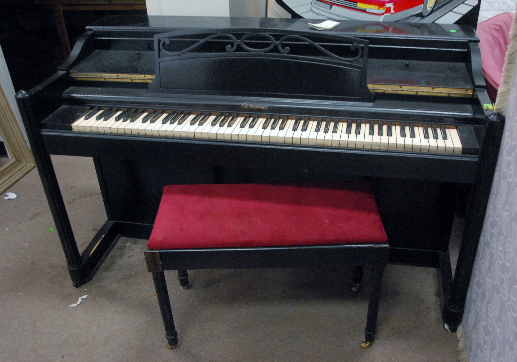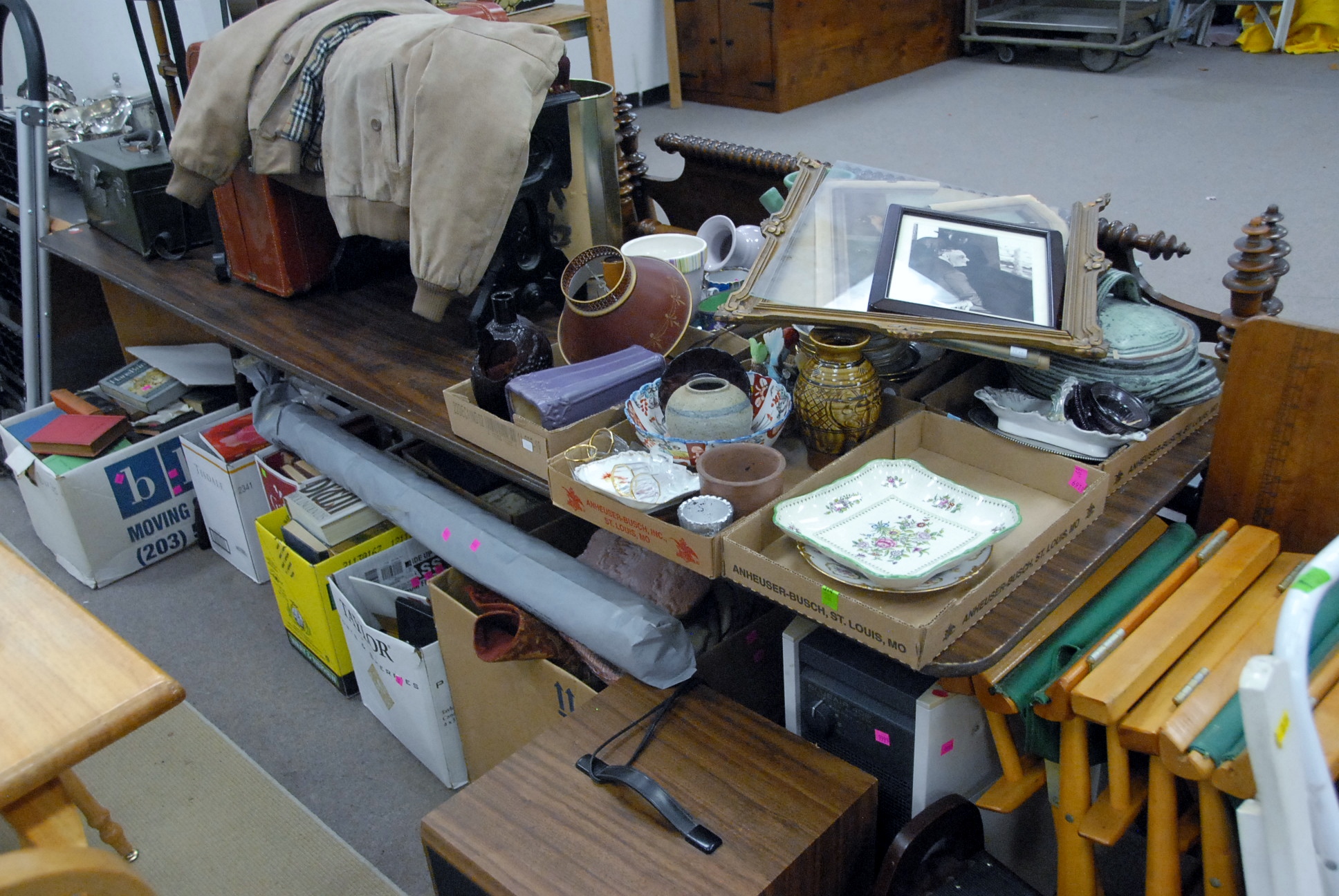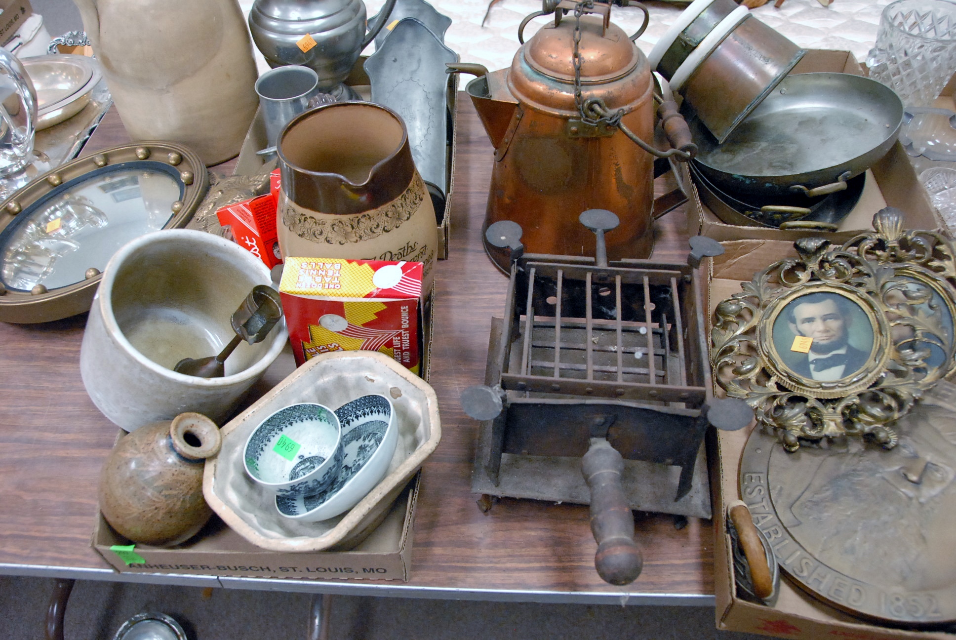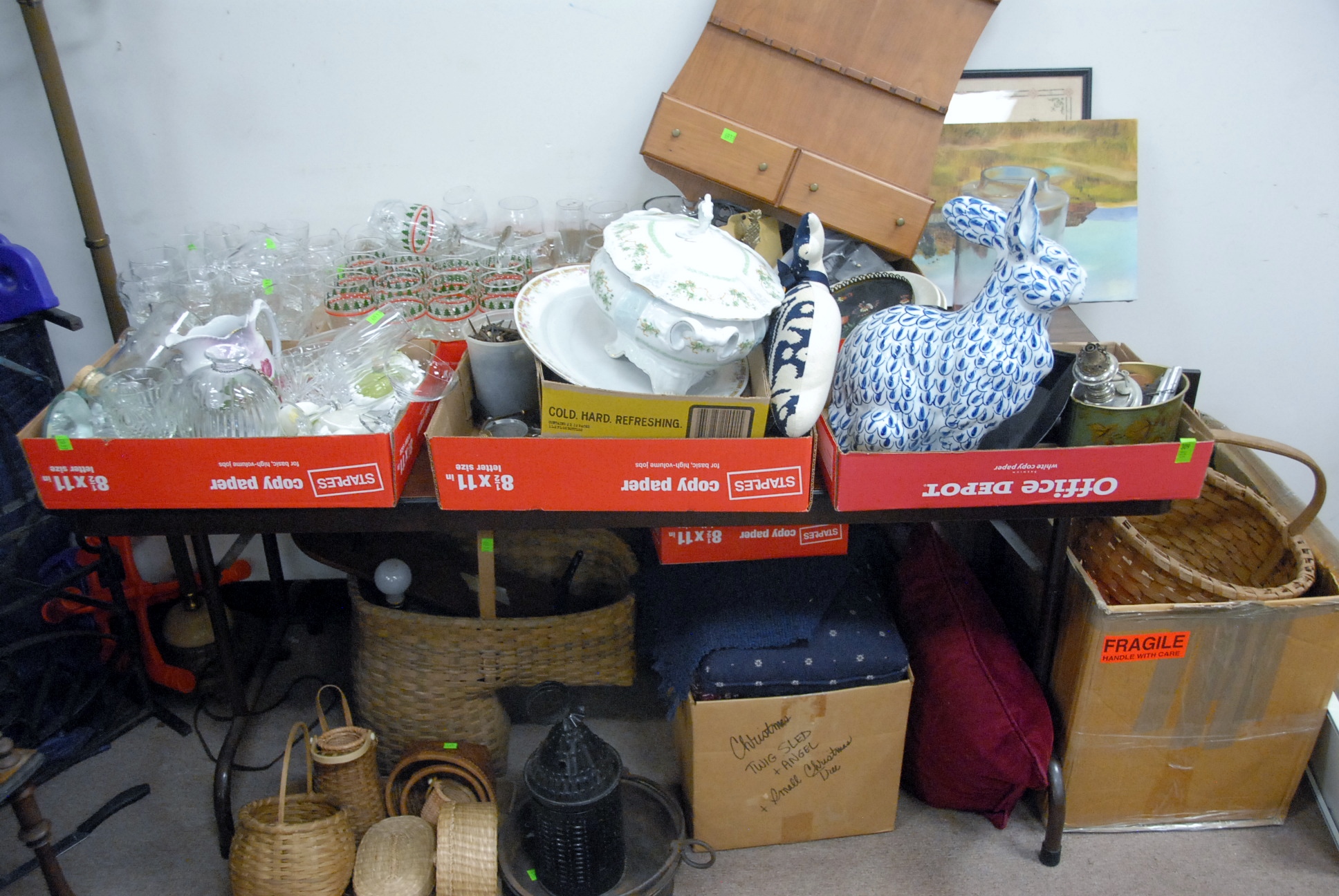 On top and below table to include glass, china, vintage toys, commode, rotisserie, golf clubs, baseball bats, lamps, Yamaha stereo equipment, records, trunk, mirrors, etc.