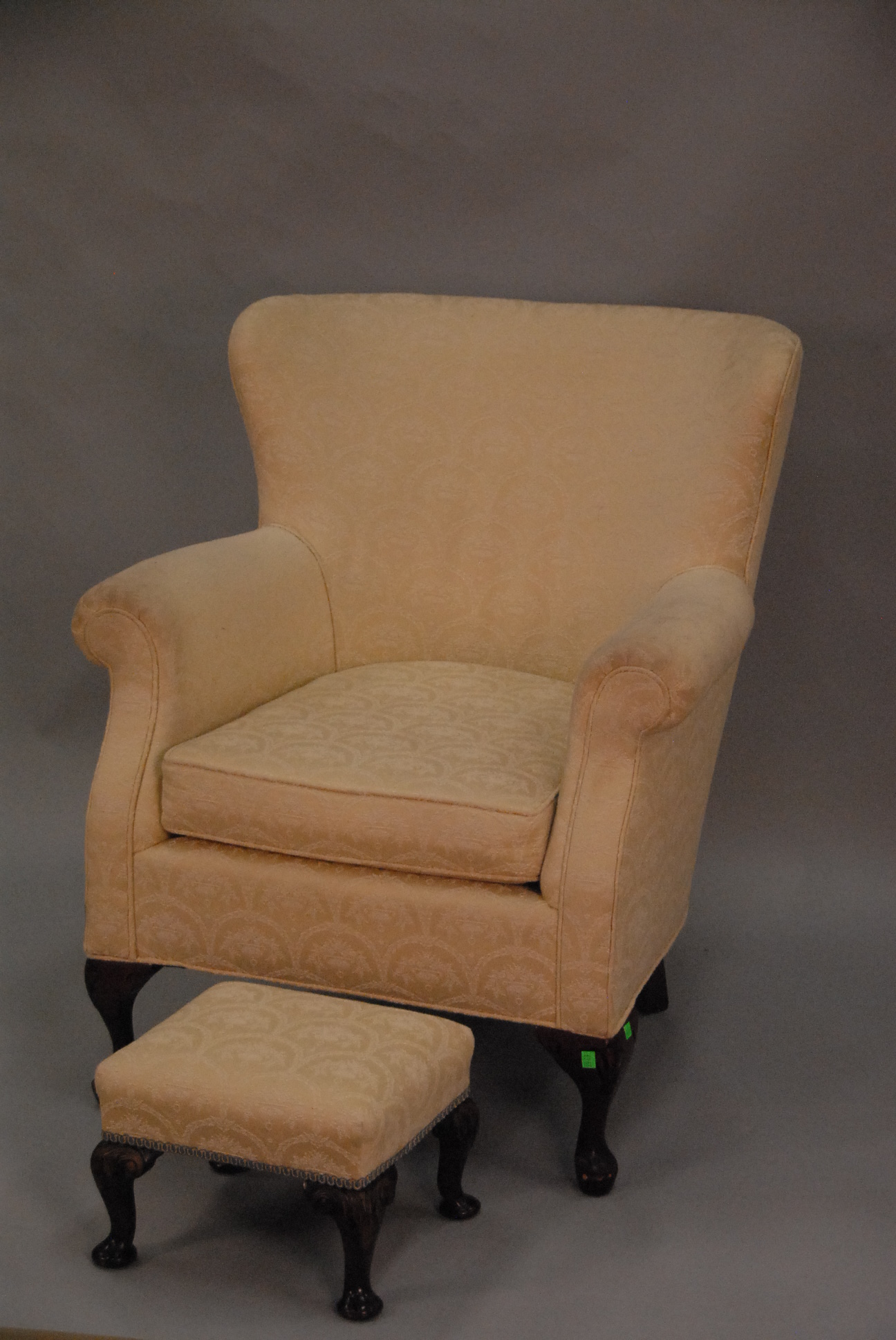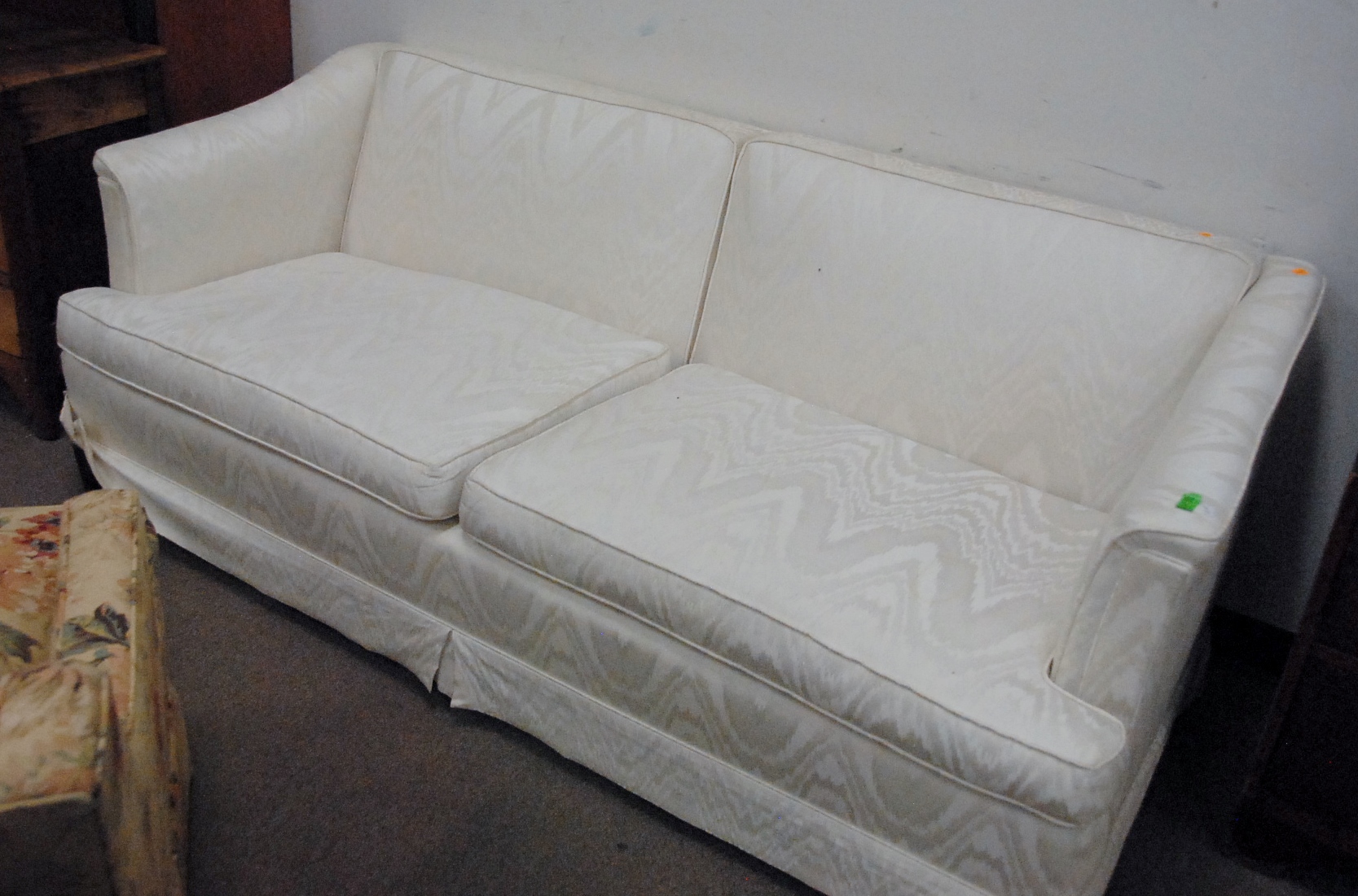Six piece lot to include dovetail walnut lift top box, ladies chair, pine chest, one drawer stand, inlaid three tier stand missing foot, and Victorian loveseat.