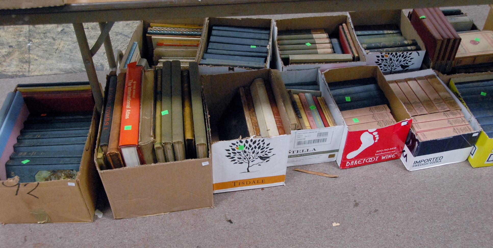 Beneath two tables to include 18 boxes of books and 2 boxes of quilts.