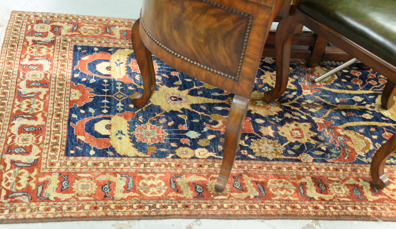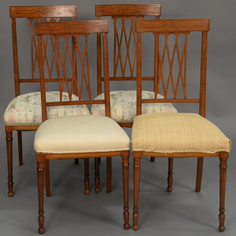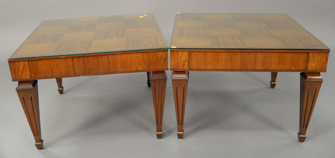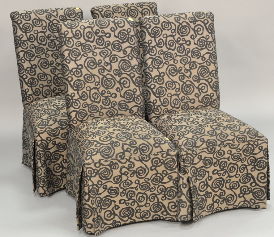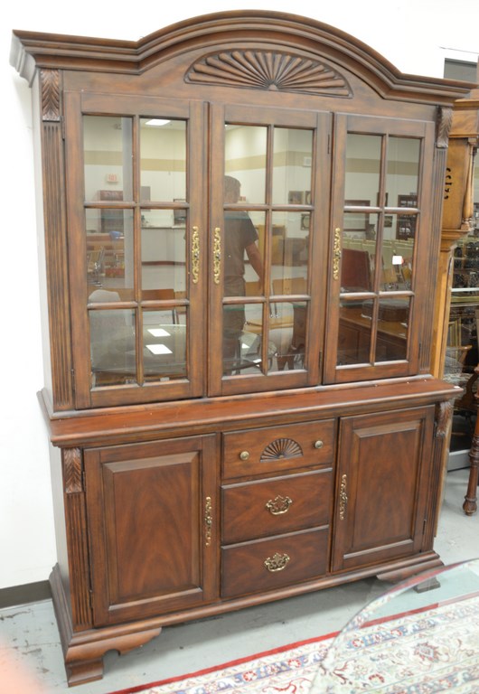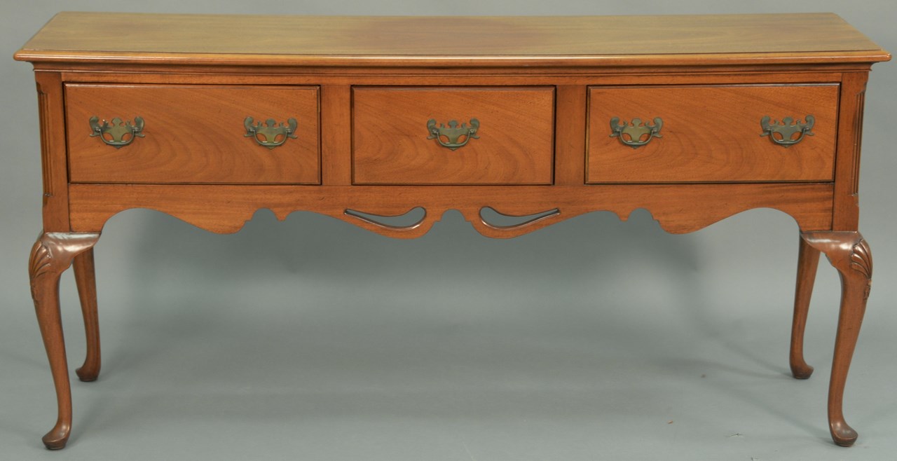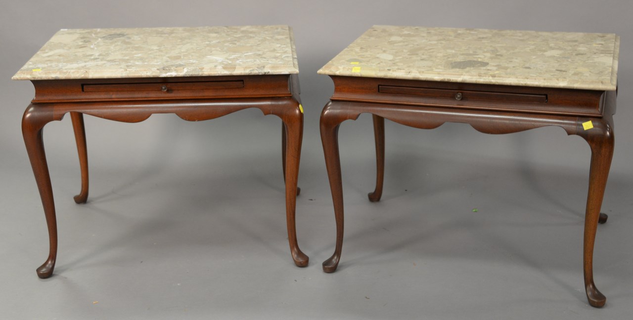 Seven piece dining set including glass top table with carved mahogany base and six upholstered Queen Anne style side chairs. table: ht. 29 1/2 in. dia. 54 in.