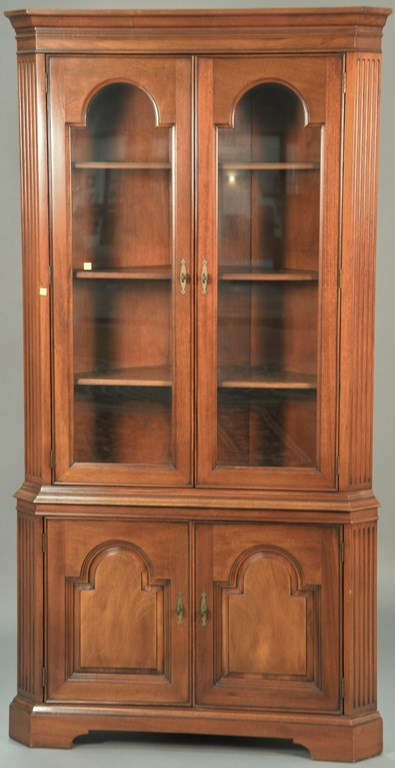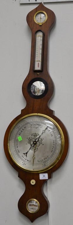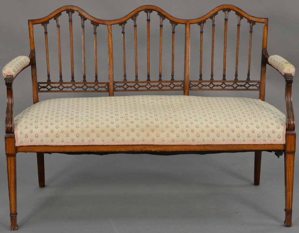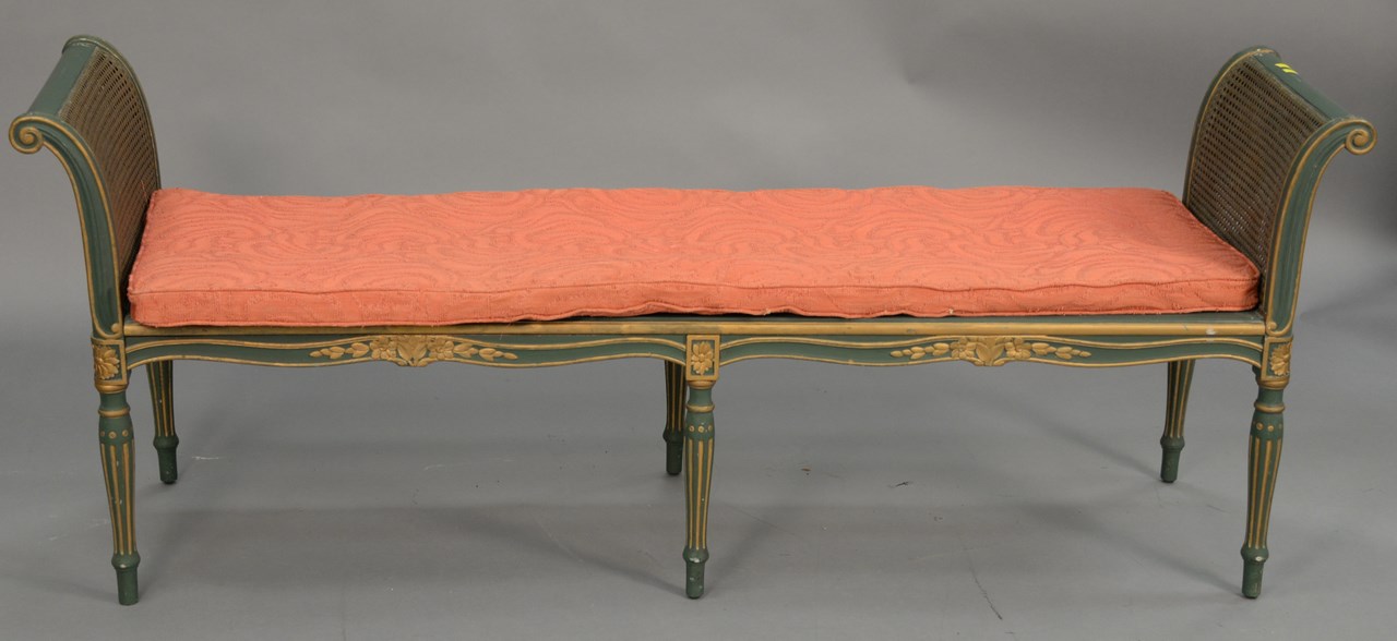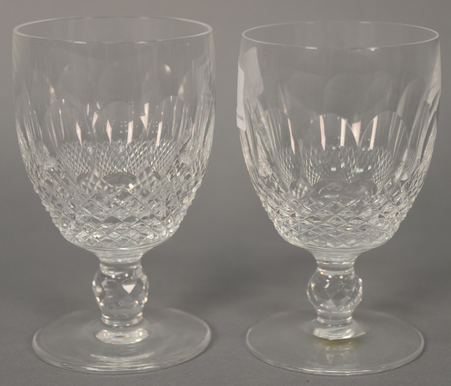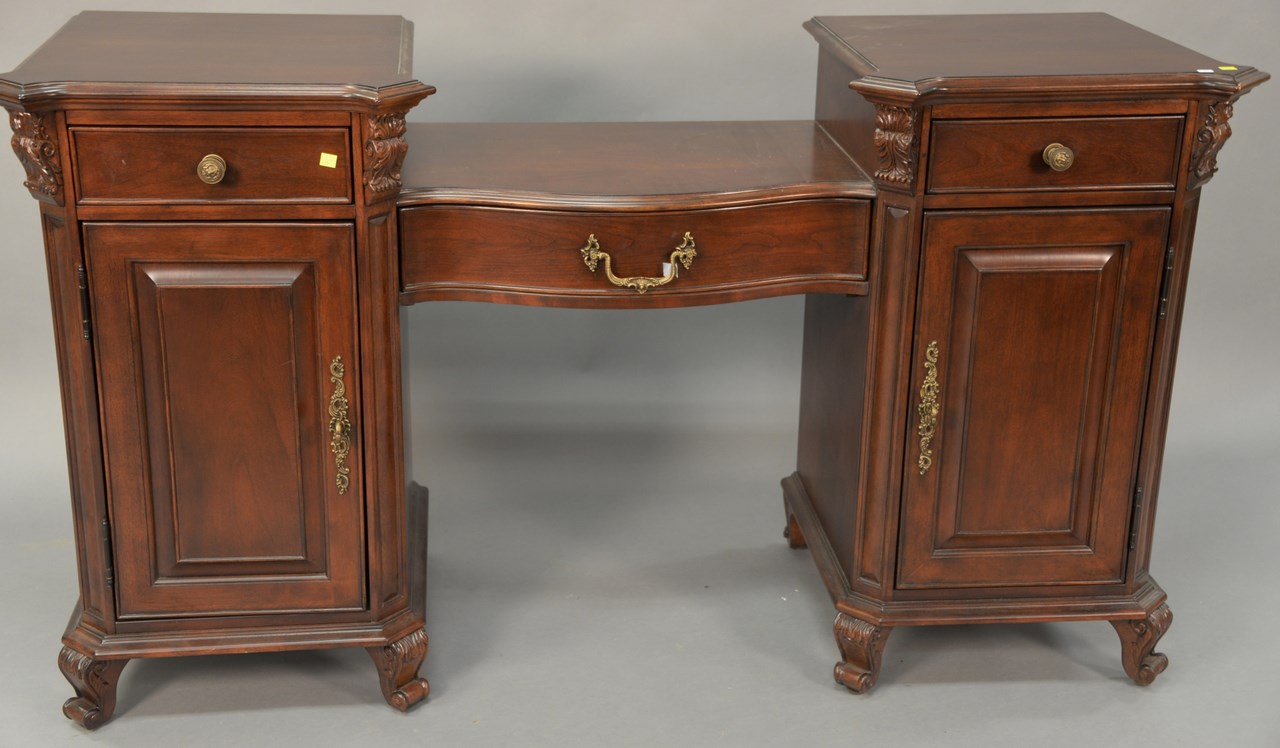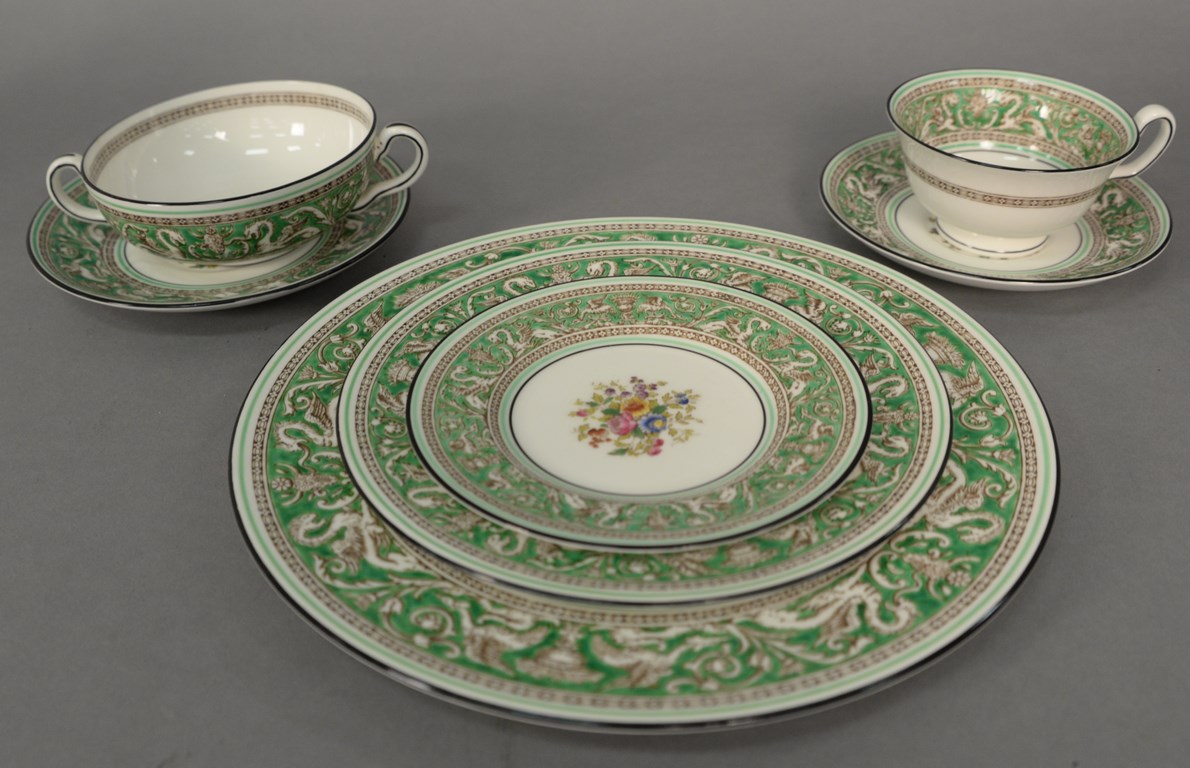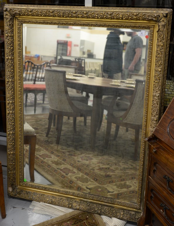 Seven piece dining set including glass top table with carved mahogany base and six upholstered Queen Anne style side chairs. table: ht. 29 1/2 in. dia. 54 in.