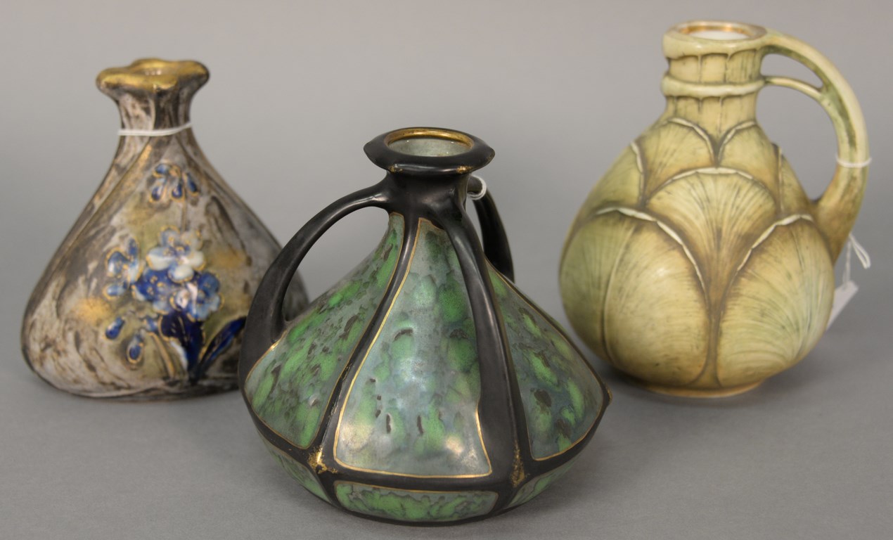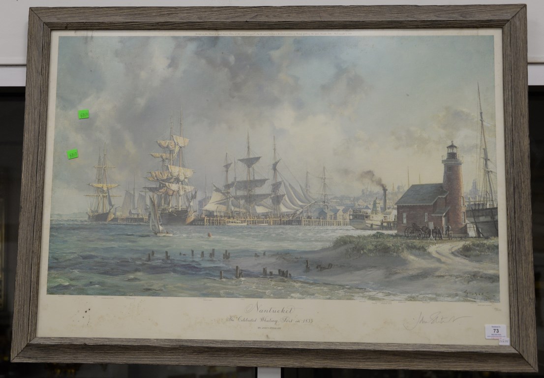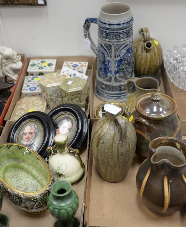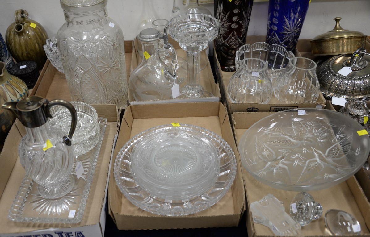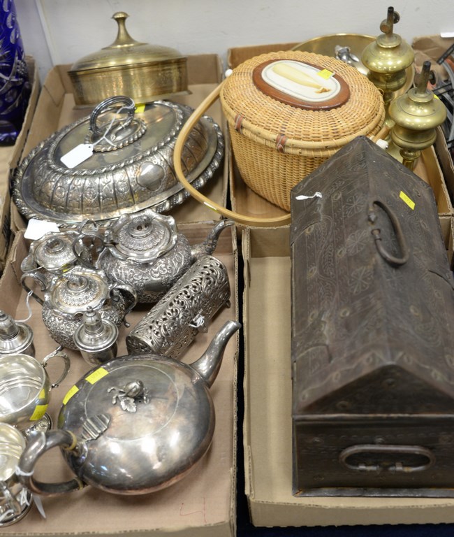 Four box lots to include three piece silverplated tea set, covered tureen, pair of brass oil lamps, silverplated teapot, Nantucket style purse, and a box.