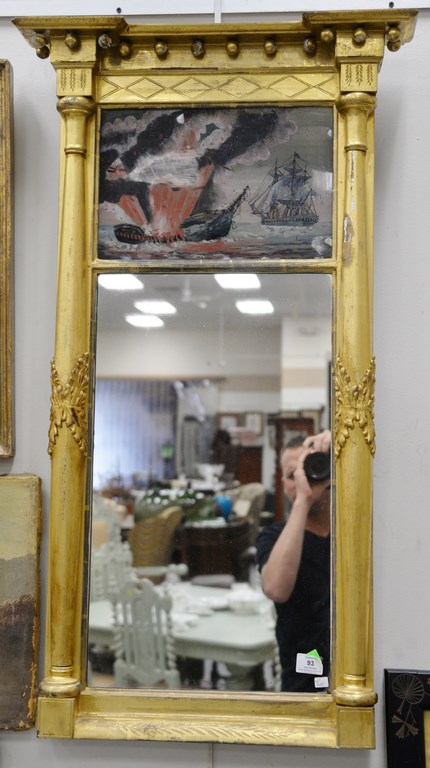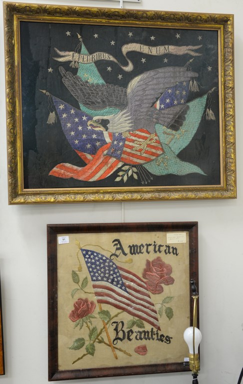 Two framed patriotic eagle embroideries including 19th century embroidery on silk of eagle with flags 24 x 30 and early 20th century embroidery of a flag with roses American Beauties 20 x 20.