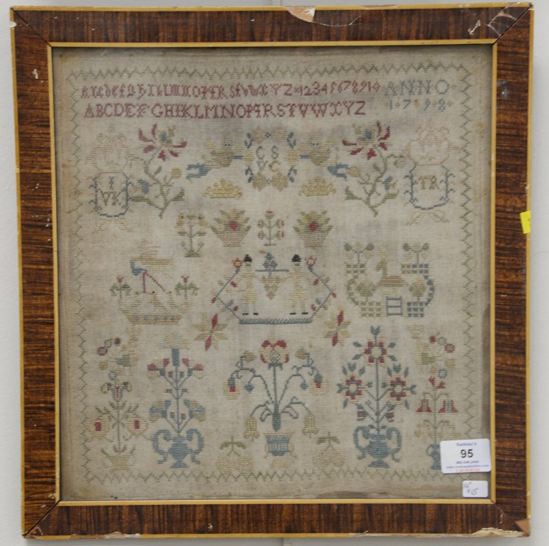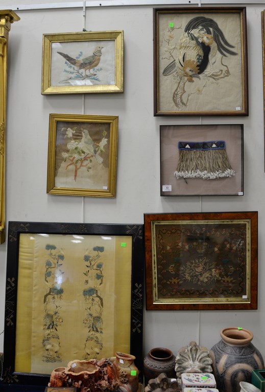 Group of six embroideries to include Oriental embroidery on silk, sampler, two embroideries of birds, watercolor of bird with feather, and beaded loin cloth for baby. largest embroidery: 19 1/2 x 16 1/2 loin cloth: lg. 8 in.