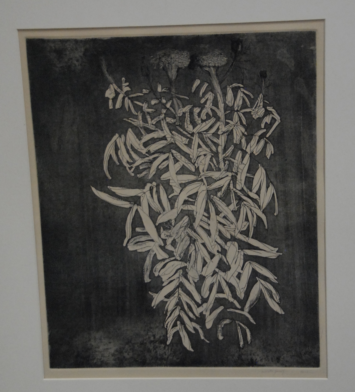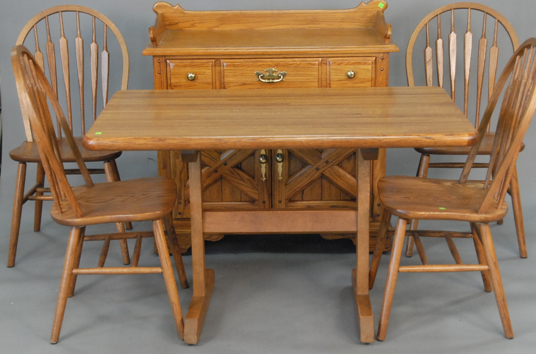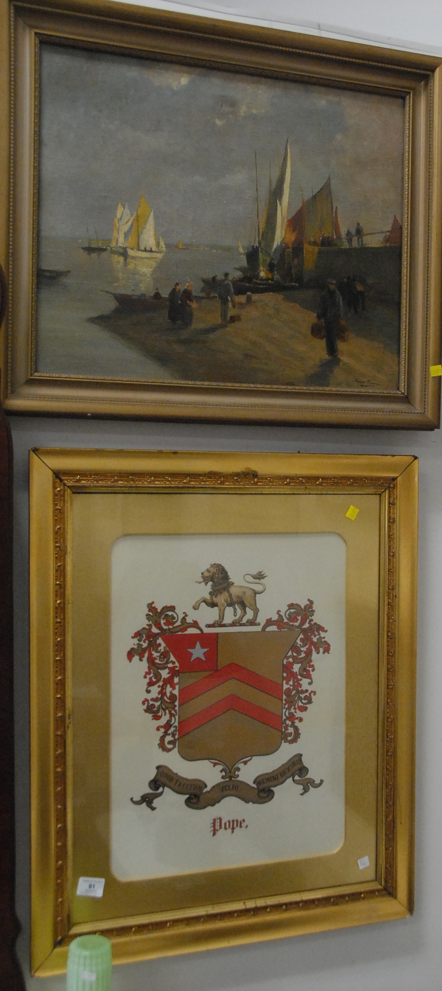 Four framed pieces including large harbor’s edge signed lower right oil on canvas Sandar Perinis 19 x 23, Fall landscape oil on canvas signed lower right Martin 14 x 17, oil on board Dock signed lower left Ray Williams 12 x 16, and a watercolor of shield marked Pope.