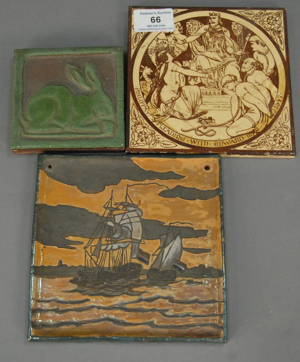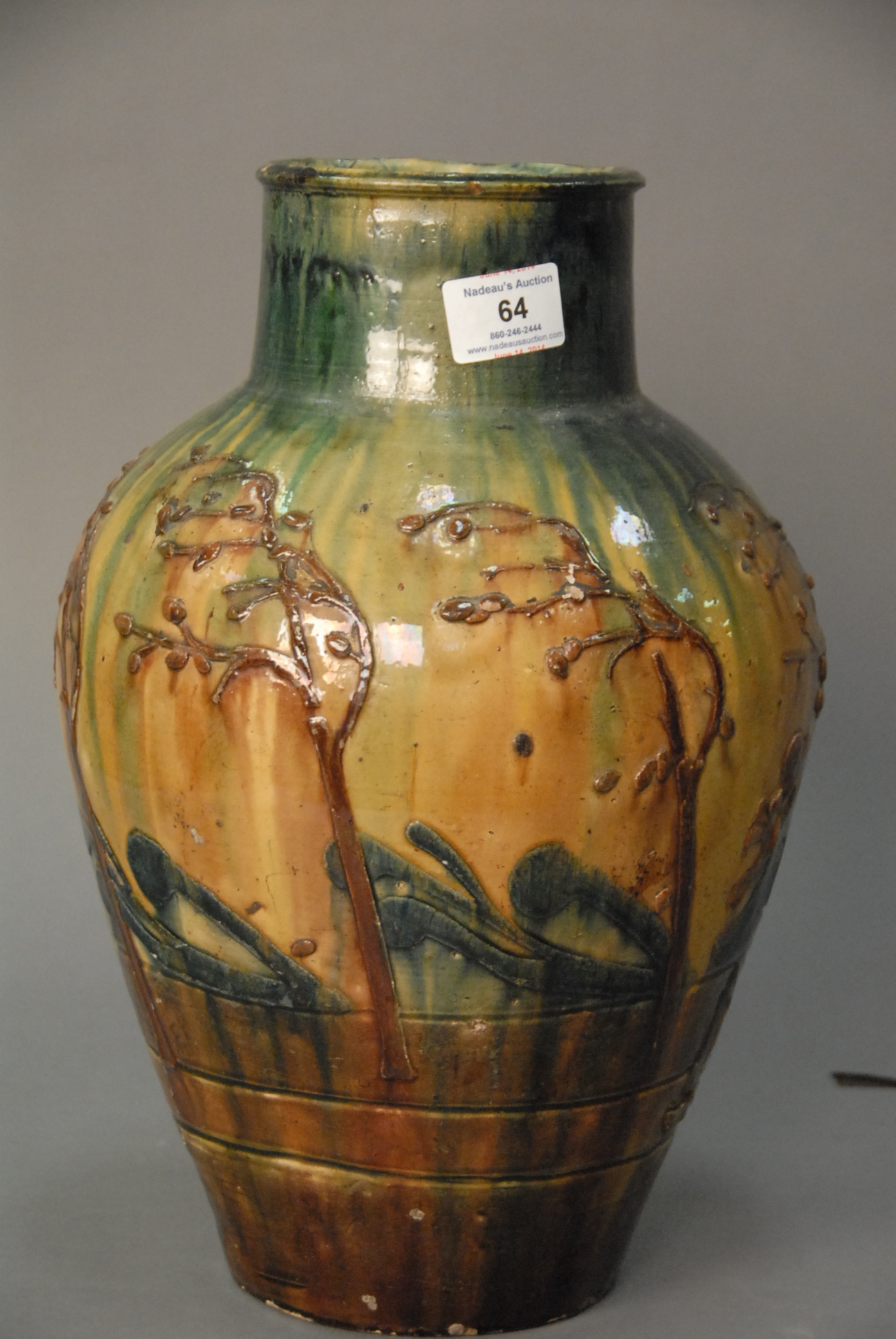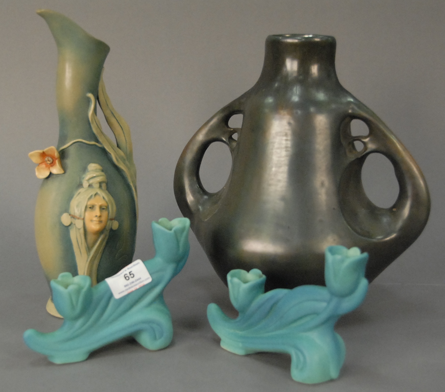 Four piece lot to include Bernard Block art nouveau Nymph vase ht. 12in., Amphora handled vase ht. 11 1/2in., and pair of Van Briggle candle holders ht. 5in.