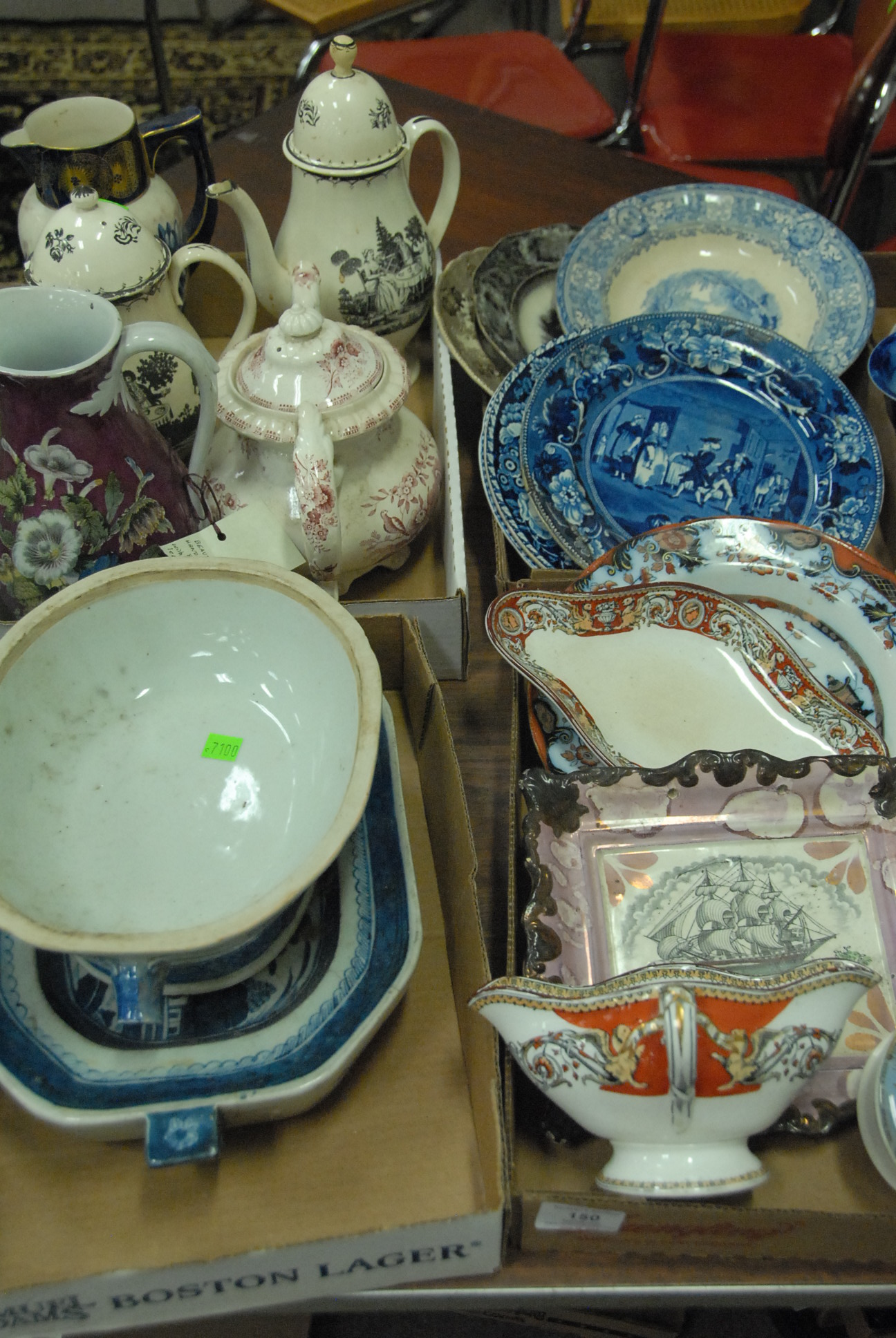 Five box lots to include blue and white plates, serving pieces, pitchers, Canton warming plate as is, Canton serving bowl, etc.
