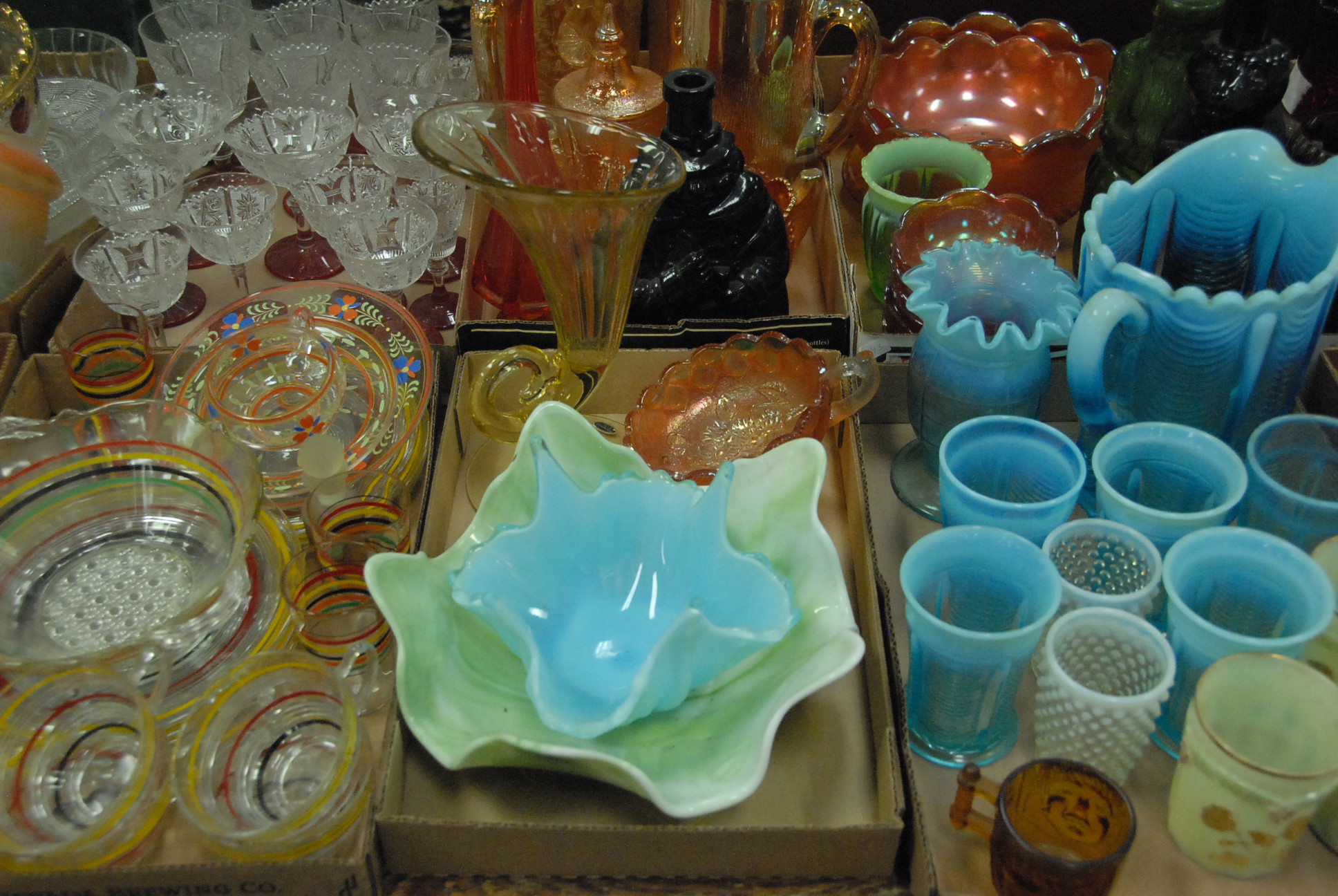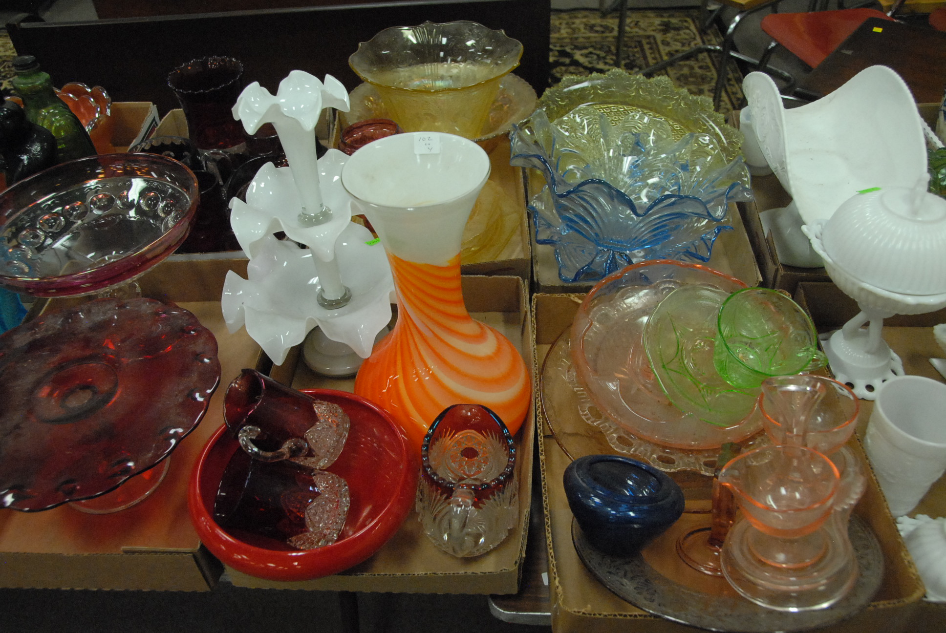 Eight boxes of glass to include milk glass, depression glass, cranberry glass, etc.