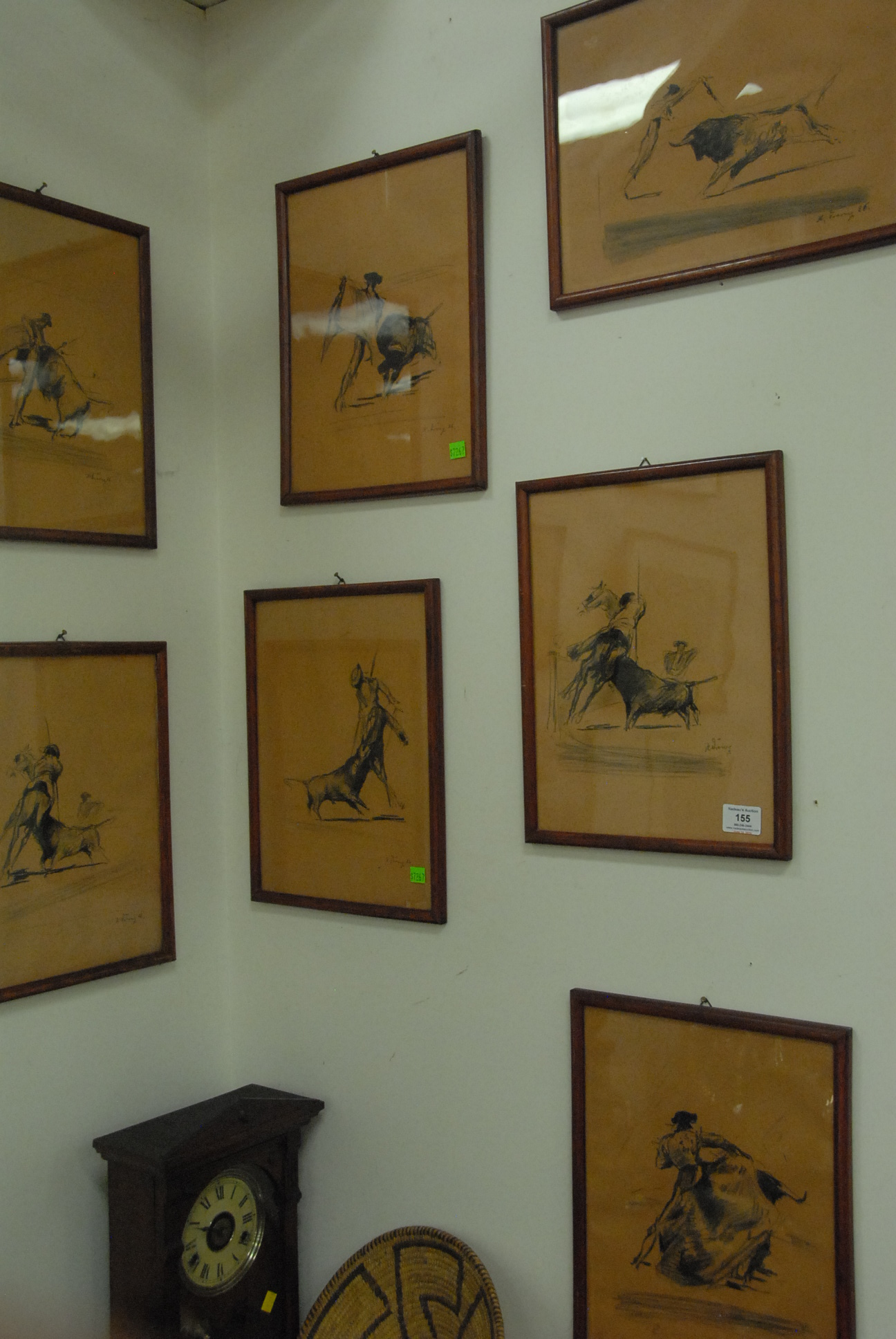 Group of seven framed charcoals bull fighting signed lower indistinctly, approximately 10 1/4 x 13 1/2.