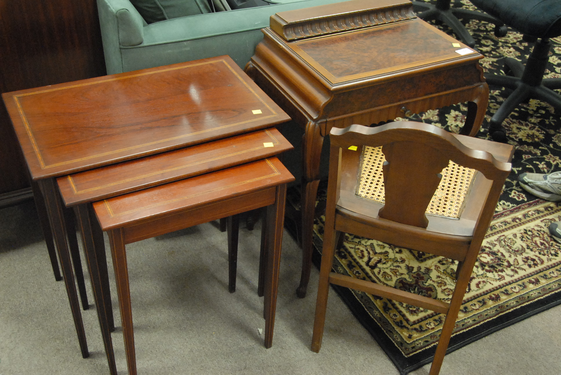 Five piece lot to include burlwood sewing table, small chair, and nest of three tables.