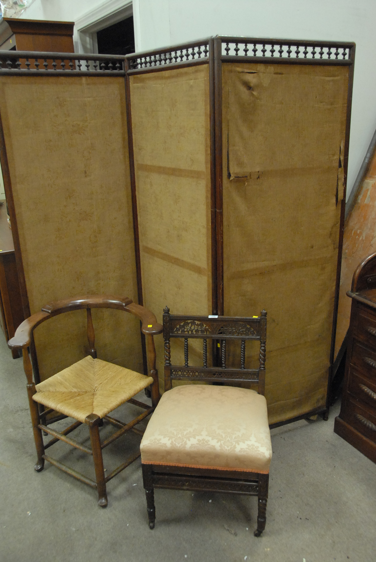 Three piece lot to include Bamboo style three fold screen and two chairs including Queen Anne corner chair and Victorian side chair.
