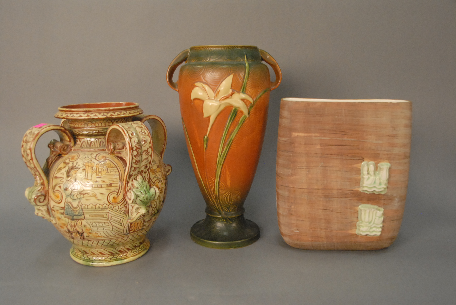 Three large vases including large Roseville vase ht. 16in., Demaray vase ht. 12in., and large pottery vase with handles ht. 12in.
