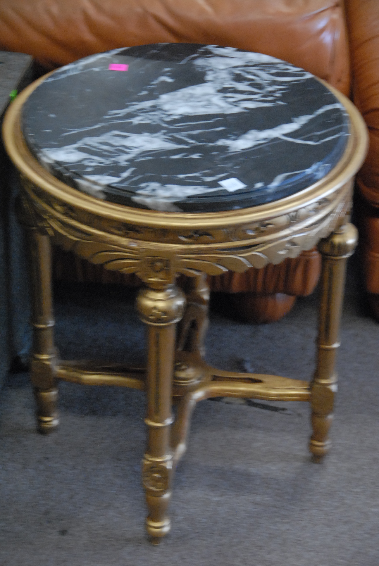 Small round French style gilt table with black marble top, ht. 21in. dia. 17 1/2in.