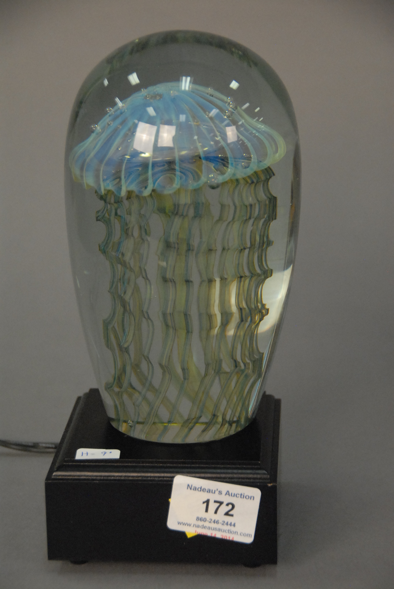 Robert Eickholt art glass jelly fish, opal with bubbles paperweight with light base, ht. 9in.