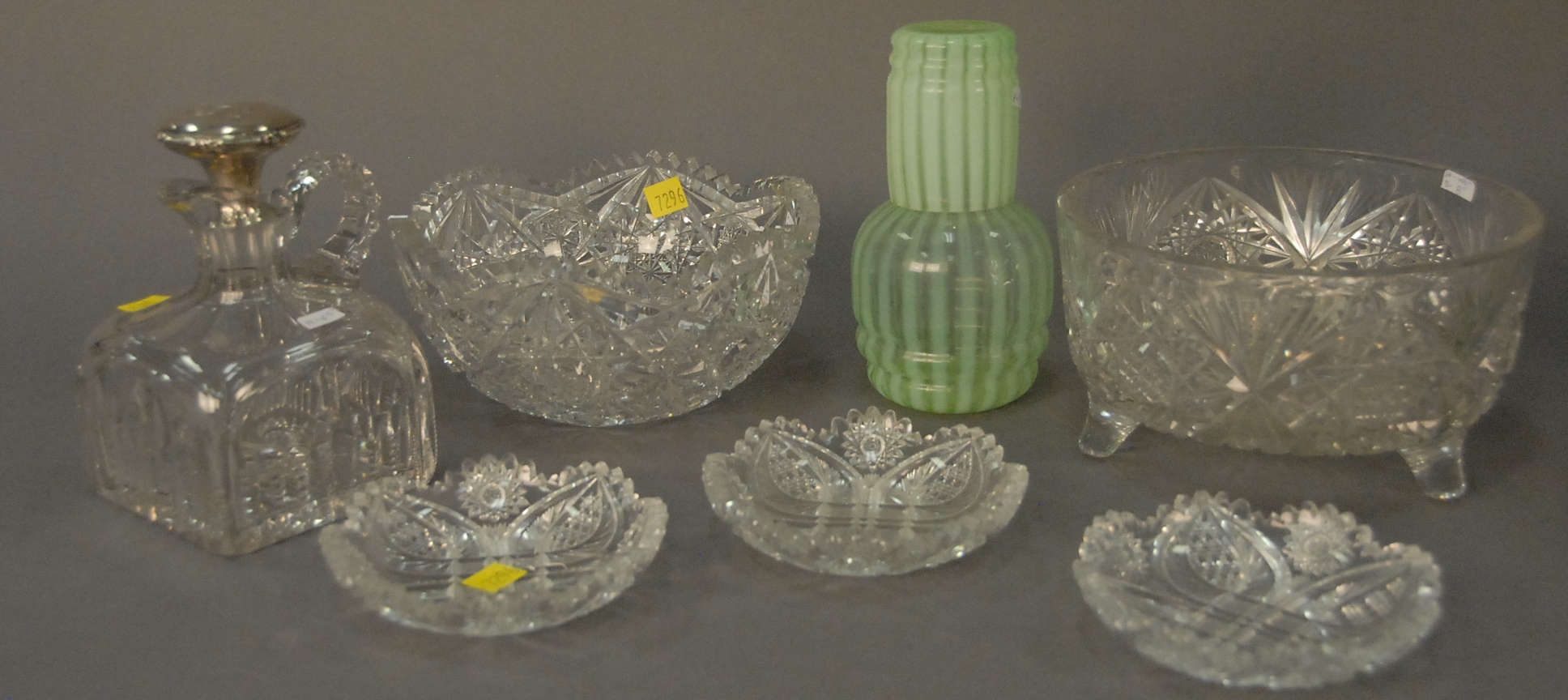 Group of seven crystal pieces including five cut glass dishes, crystal decanter with silver top, and art glass bottle with glass.